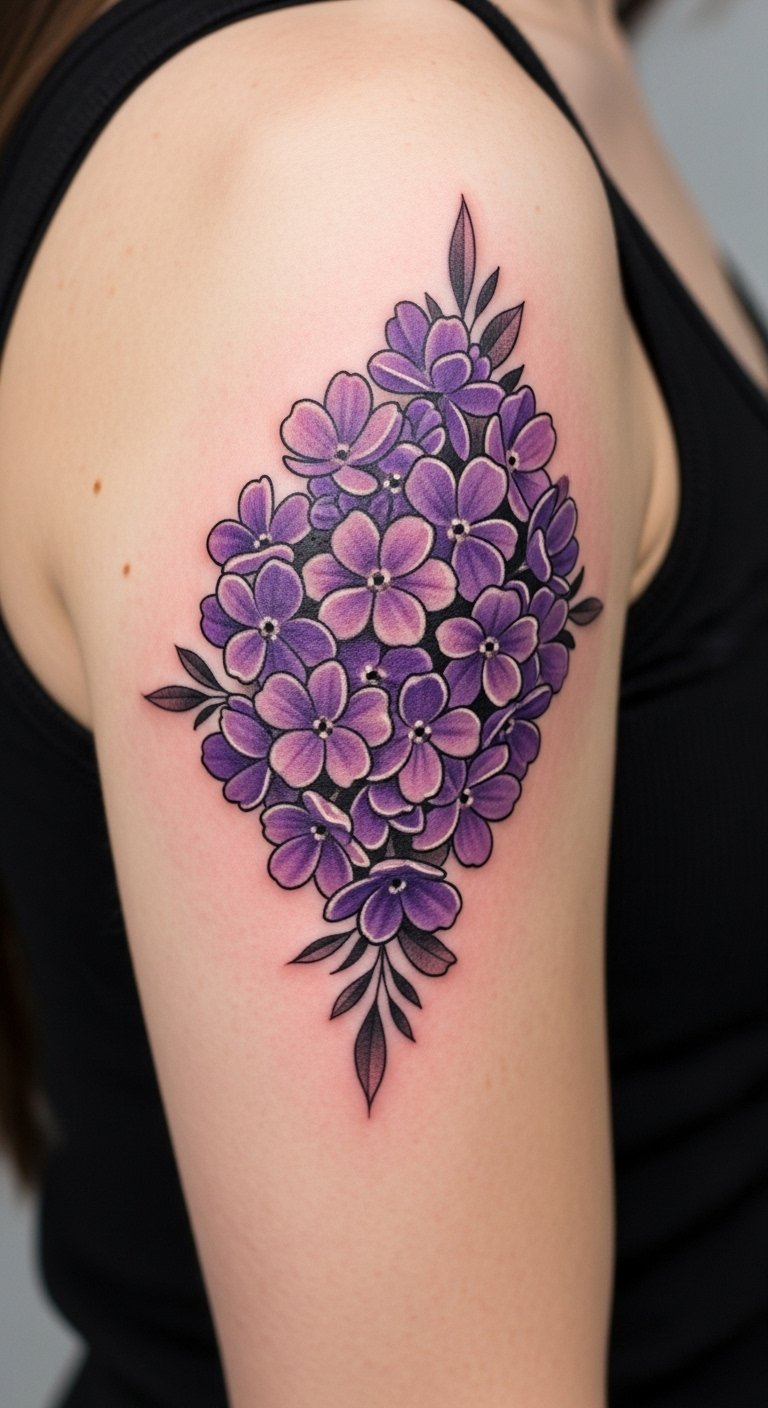 A shaded violet cluster on your upper arm builds depth. Envision shaded blooms that pop with light, symbolizing peace. Practice shading with pencils. Go for arm art under $200. Place it high for muscle definition. Vary shades for interest. This design feels empowering, ready for display. Heal it carefully for vibrancy.