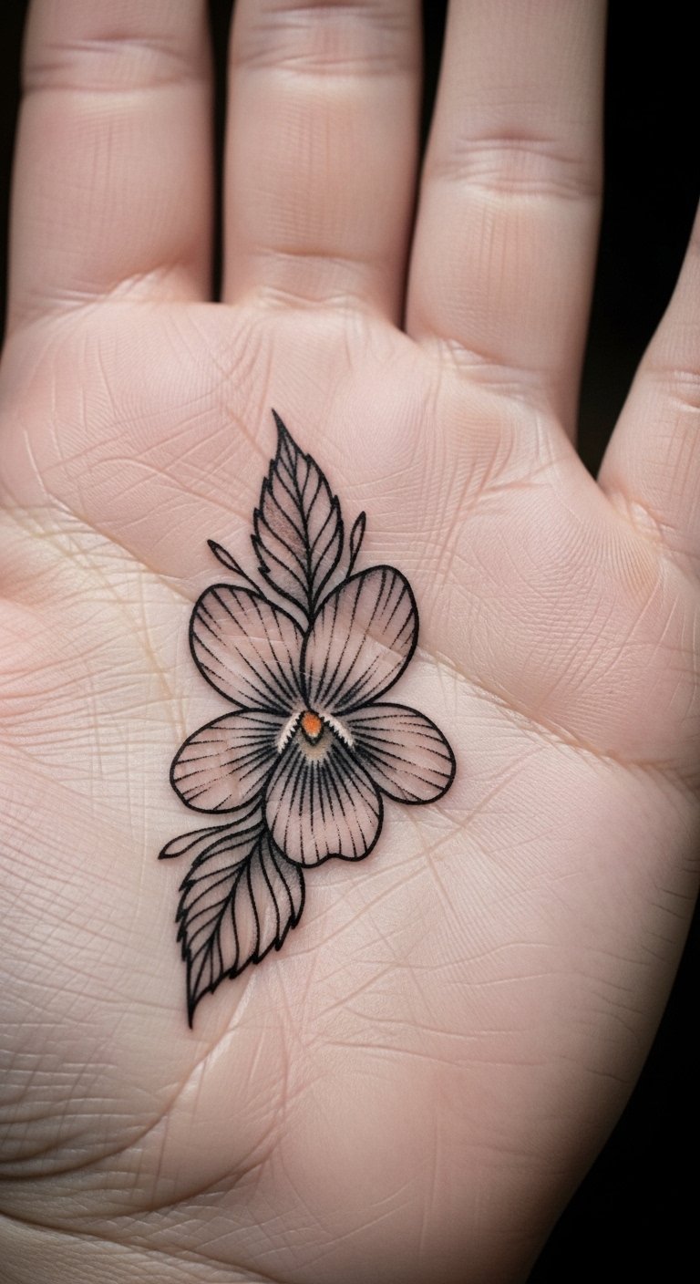 A violet with leaf accent on your palm integrates nature. Picture a flower and leaf in your hand, for growth. Draw on your palm with safe pens. Find palm tattoos for low costs, like $80. Put it on a less used area. Add the leaf for extra detail. This design feels interactive, ready for hand gestures. Keep it simple.