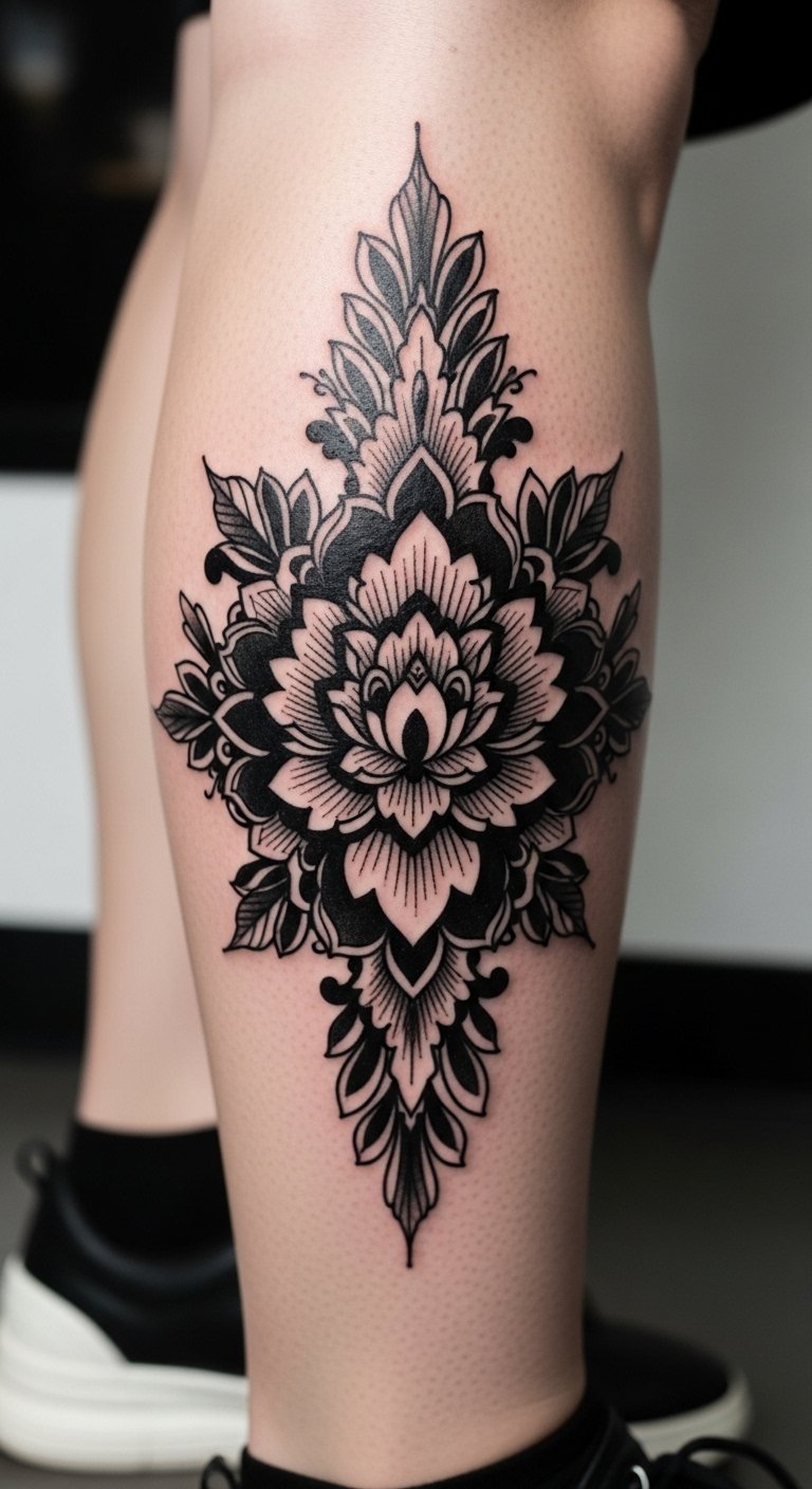 Blackwork violet on your shin offers solid presence. See a full flower in black, for enduring stories. Practice with black markers. Choose shin tattoos for deals, around $200. Put it front for visibility. Keep it dense for impact. This design grounds your leg, perfect for bold statements. Start your ink journey here.