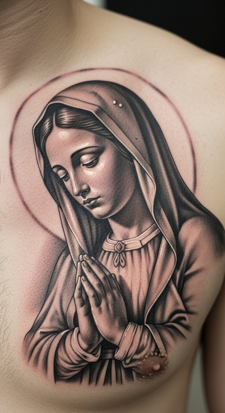 Realism makes tattoos pop. Imagine Mary’s face with every detail clear, like a photo on your skin. This style uses shading for a 3D effect. Plan ahead: snap pictures of your spot with a phone app. Free tools let you overlay designs quickly. Try drawing with charcoal at home for practice. Put it on your back for more space. Bold shadows add emotion. Keep sizes medium to cut costs. This approach lets you capture compassion affordably. End up with something that feels real and strong.
