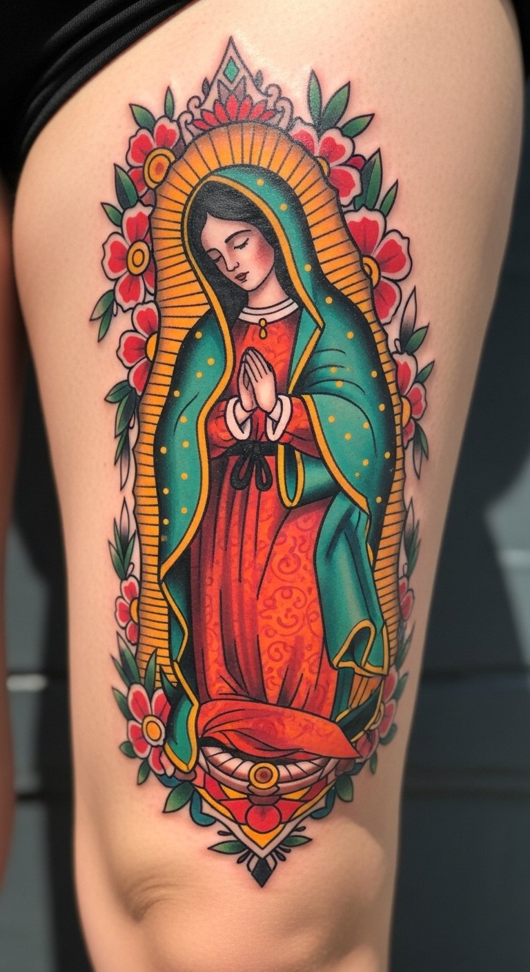 Neo-traditional mixes old and new. See Mary with fresh colors and patterns, like flowers around her. This keeps things lively. Sketch freehand at your desk to start. Apps offer templates you can tweak. Use colored markers for home trials. Place on your leg for bold statements. Bold accents, such as blue skies, make it shine. Opt for smaller versions to stay budget-friendly. This method blends faith with fun easily. Get a design that energizes your spirit.