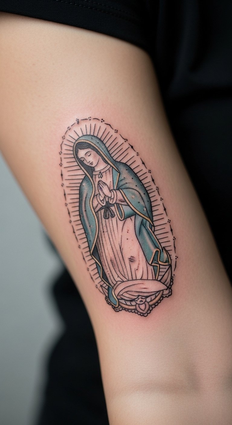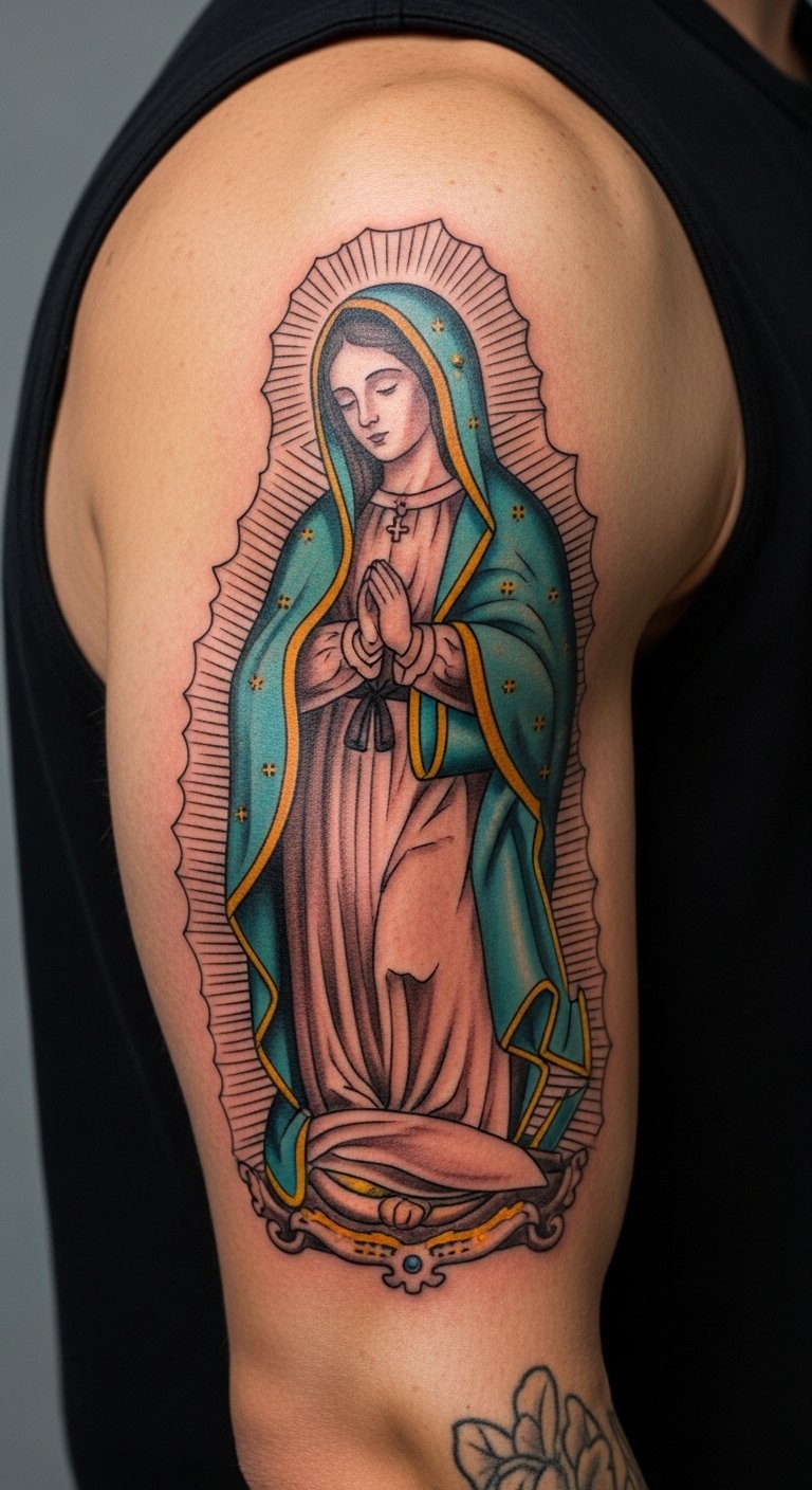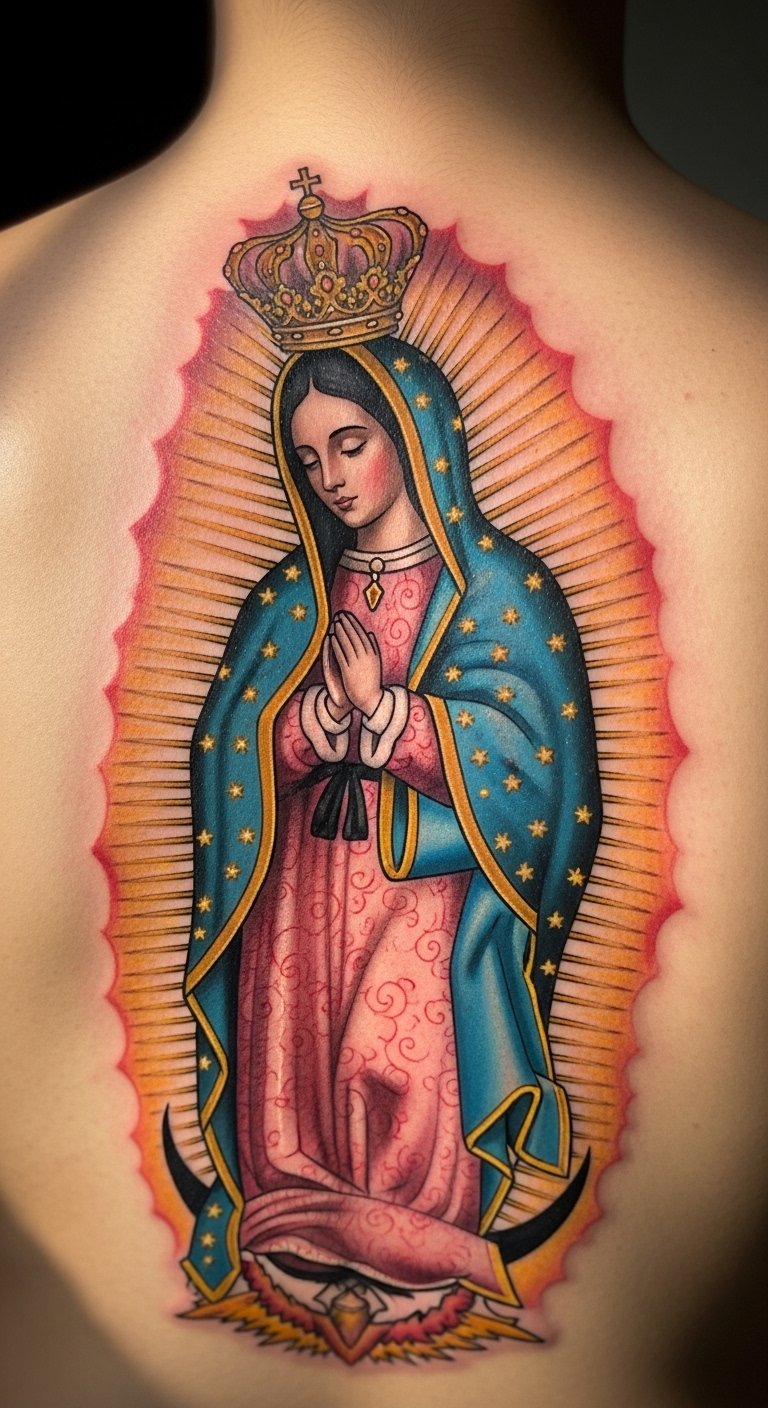 Guadalupe brings cultural flair. Imagine Mary with stars and rich tones, honoring heritage. This variant adds personal history. Research online for free ideas. Draw simple versions with crayons. Put it on your back for impact. Bold stars symbolize guidance. Go for moderate sizes to save. This tattoo connects you to roots affordably. Make it a proud expression.