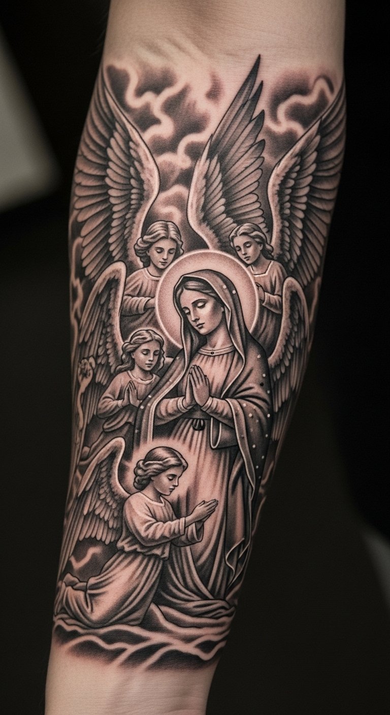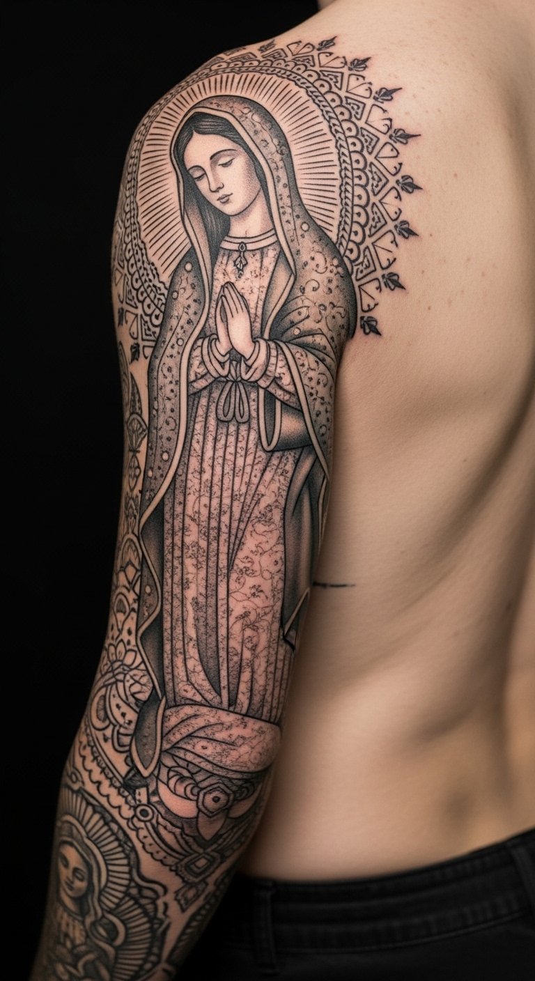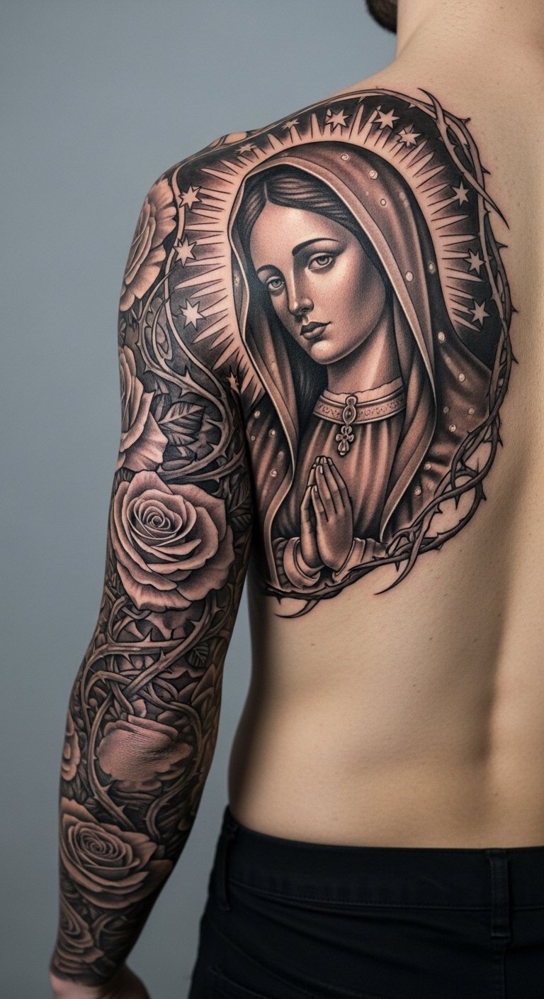 Large sleeves make a statement. Envision Mary covering your back with detailed elements. It tells a big story. Break projects into sessions for affordability. Free design tools online help. Practice with large paper drawings. Place on your back for privacy. Bold patterns add layers. Spread costs over time. This design builds your spiritual narrative gradually.