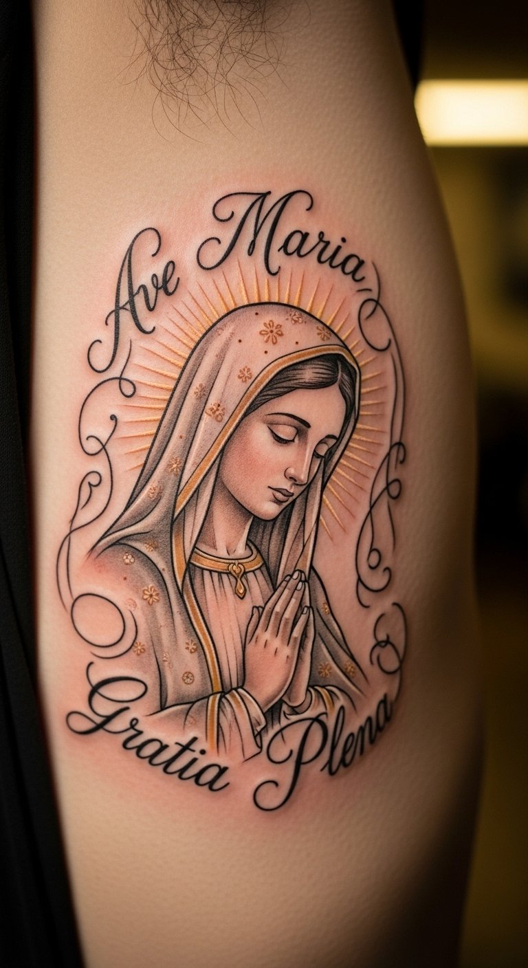 Text adds words to art. See phrases like sacred lines near Mary on your side. It personalizes the message. Write ideas on paper first. Free fonts online assist. Try temporary tattoos for testing. Put on ribs for intimate feel. Bold text highlights prayers. Keep it simple to afford. This combo deepens your connection.