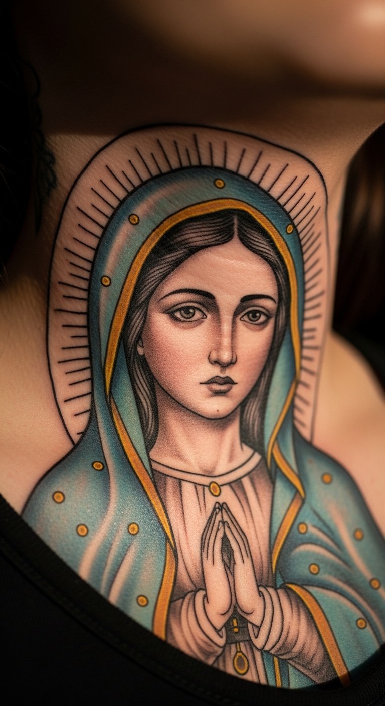 Protection themes inspire. See Mary as a guardian on your neck. It wards off worries. Plan with daily notes. Free videos guide ideas. Sketch protective symbols. Put on visible spots. Bold eyes convey safety. Keep designs straightforward. This tattoo offers real comfort.