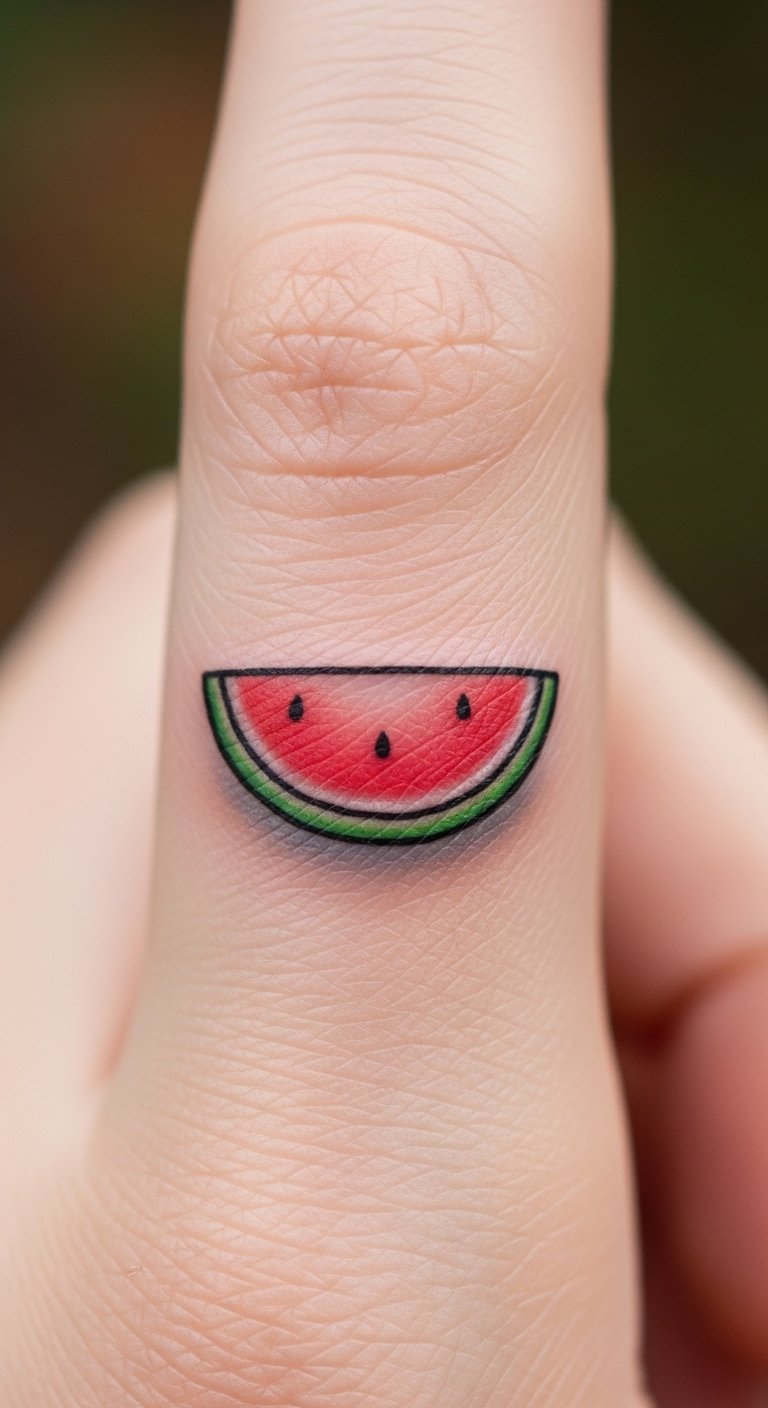 Think small and sweet for a finger tattoo. A minimalist watermelon fits perfectly here. Start with a basic outline of the fruit. Use black ink for a clean look. This design takes little time and costs less than bigger ones. Pick a local artist who does fine lines. They charge around $50 to $100. Draw it yourself on paper first as practice. Use a pen to sketch the shape. Add it to your daily routine to see how it feels. Keep it hidden at work if needed. Go for hypoallergenic ink to avoid irritation. This tattoo shows off your playful side without overwhelming your look.