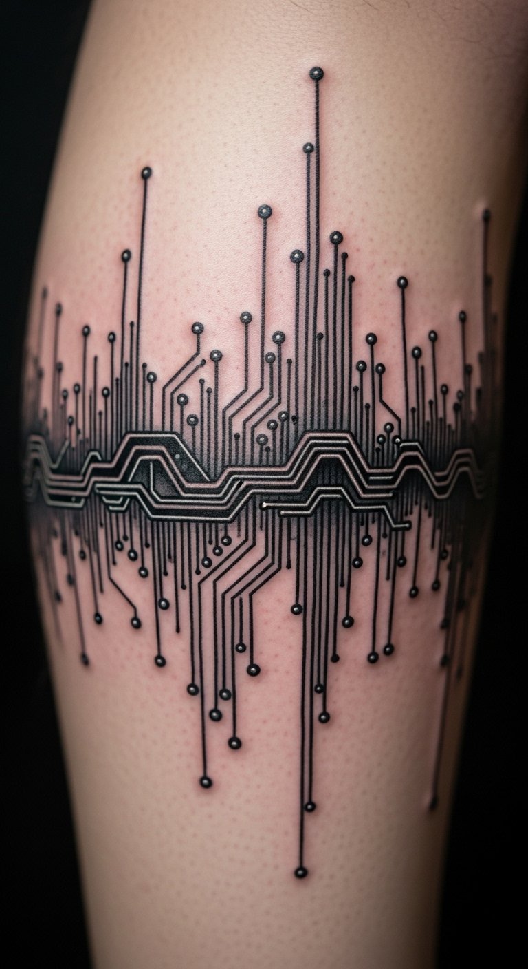Glitch wave tattoos add tech glitches to waves for a futuristic edge. Bold these words: glitch waves. Use phone effects to mock up ideas. This is quick and free. Find artists into digital styles. These tattoos stand out uniquely.