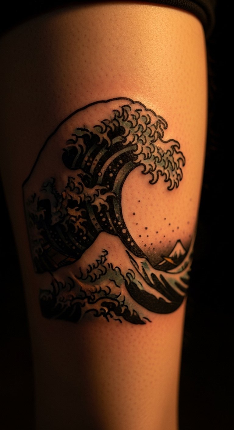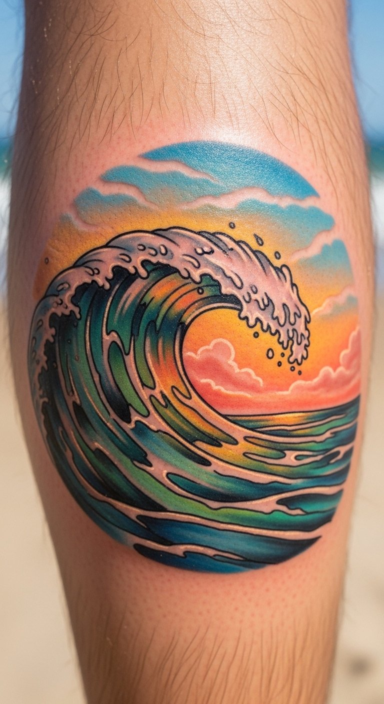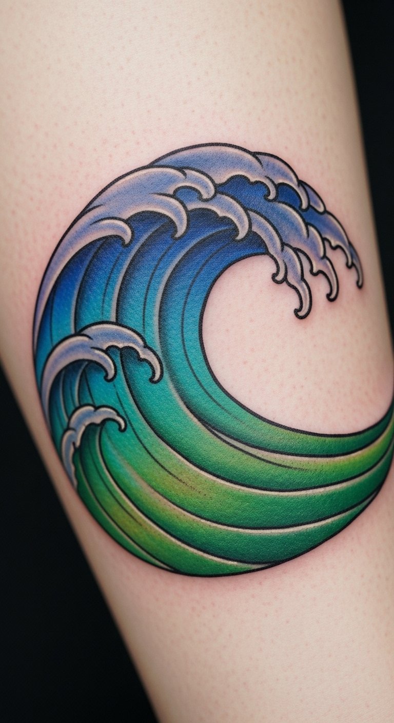 Custom gradient wave tattoos use color fades for depth. They personalize your wave story. Bold these words: gradient waves. Blend colors on paper to experiment. This DIY is cost-effective. Share your vision with artists for perfect results.