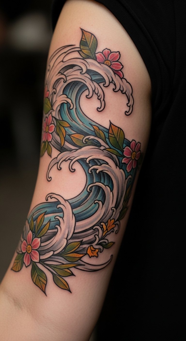 Floral wave tattoos blend waves with plants for a nature theme. Think waves wrapped in leaves or blooms. This creates a fresh, earthy design. Bold these words: floral waves. Gather ideas from garden walks and sketch them. This DIY method is free. Place them where they can grow with your style. Look for artists who do nature art. Keep sizes modest to save on costs.