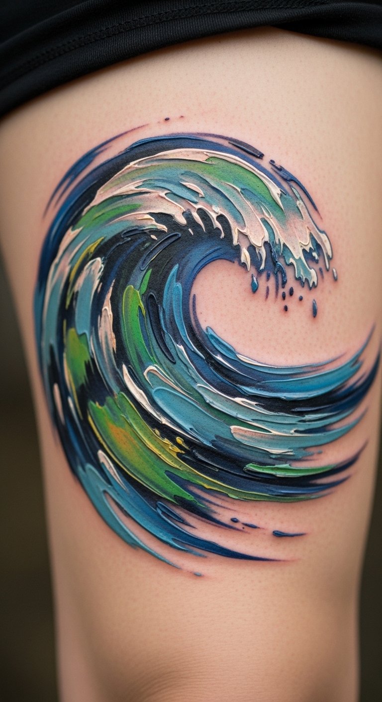 Abstract brushstroke wave tattoos look like quick art strokes. They use colors and flows for a dynamic feel. Bold these words: brushstroke waves. Experiment with paintbrushes on paper for ideas. This keeps costs low. Find artists who enjoy creative freedom. These designs add movement to your skin. Start with simple strokes in your notebook.