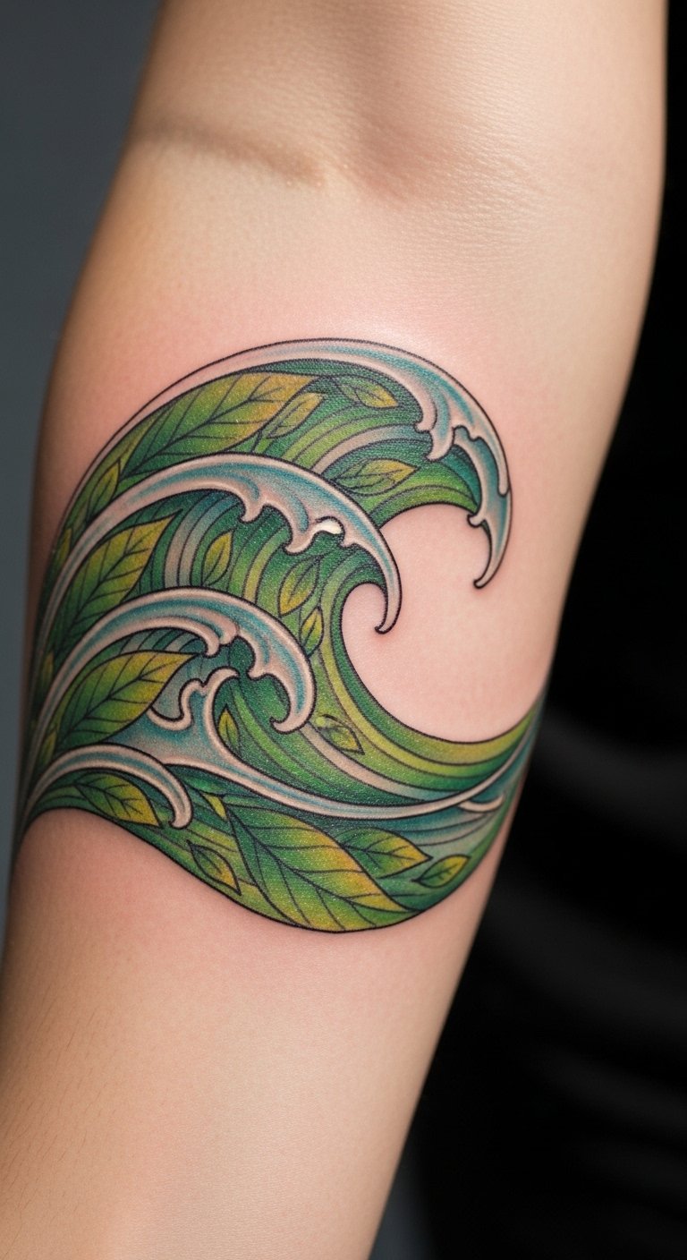 Eco wave tattoos highlight nature with green themes. They incorporate elements like leaves to promote awareness. Bold these words: eco waves. Collect leaves and trace them for designs. This activity is budget-friendly. Seek artists who use natural inks. These tattoos reflect personal values without extras. Plan with recycled paper sketches.