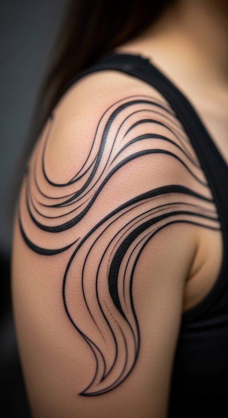 Shoulder wave tattoos follow your body’s curves for a natural flow. They make waves feel alive. Bold these words: shoulder waves. Pose in a mirror and draw ideas. This method costs nothing. Artists price based on area size. These tattoos enhance your outline. Use tape to outline first.
