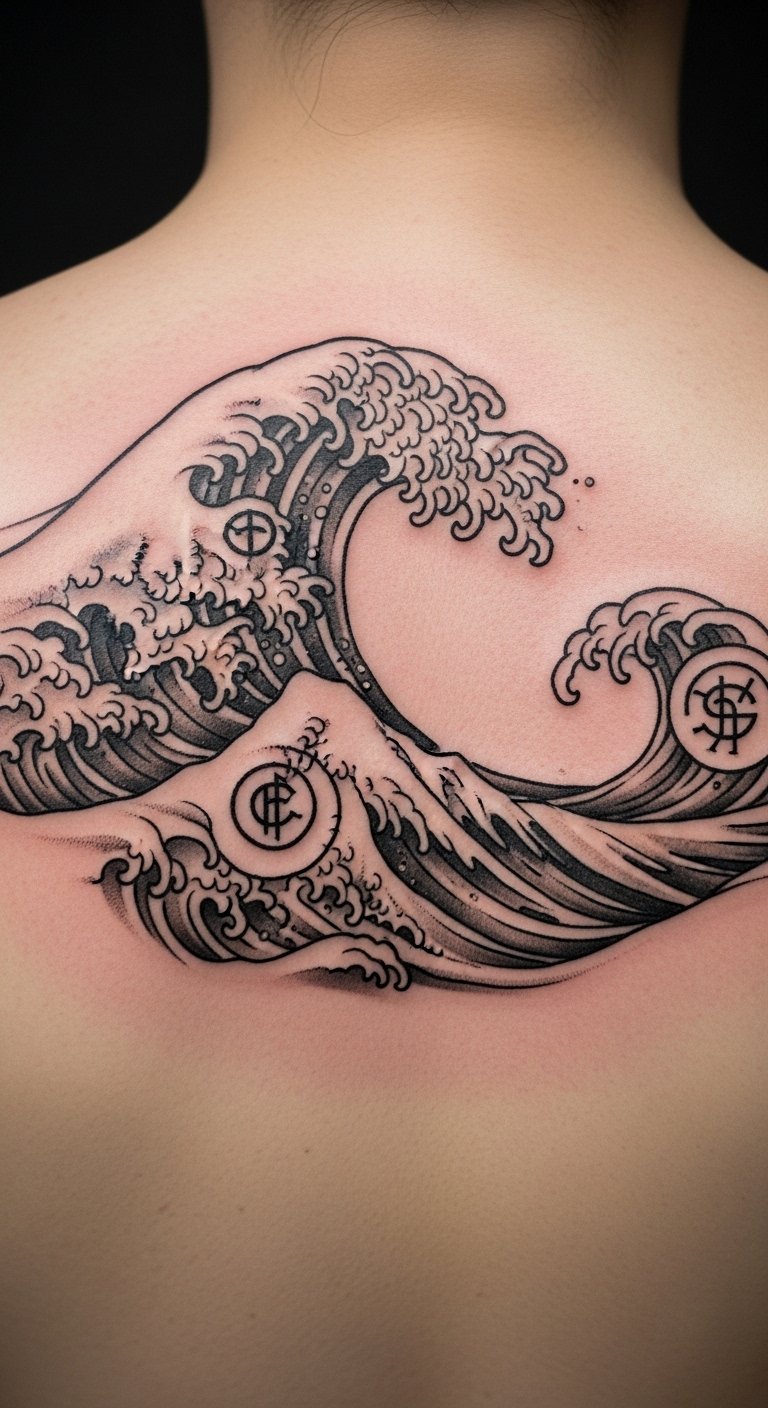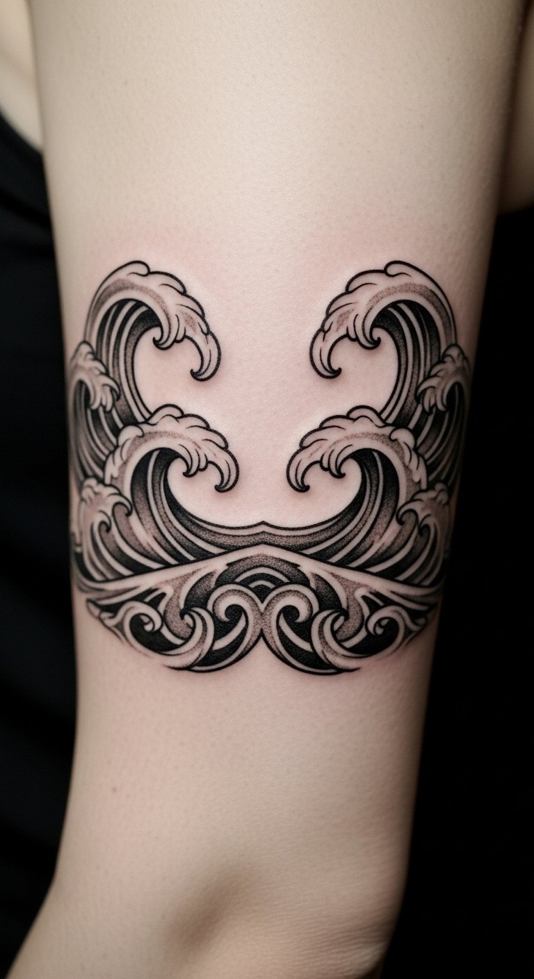 Symmetrical wave tattoos use mirrors for perfect balance. They create a harmonious design. Bold these words: balance waves. Fold paper to make symmetrical drawings. This practice is simple. Artists can guide the symmetry. These tattoos offer calm visuals.