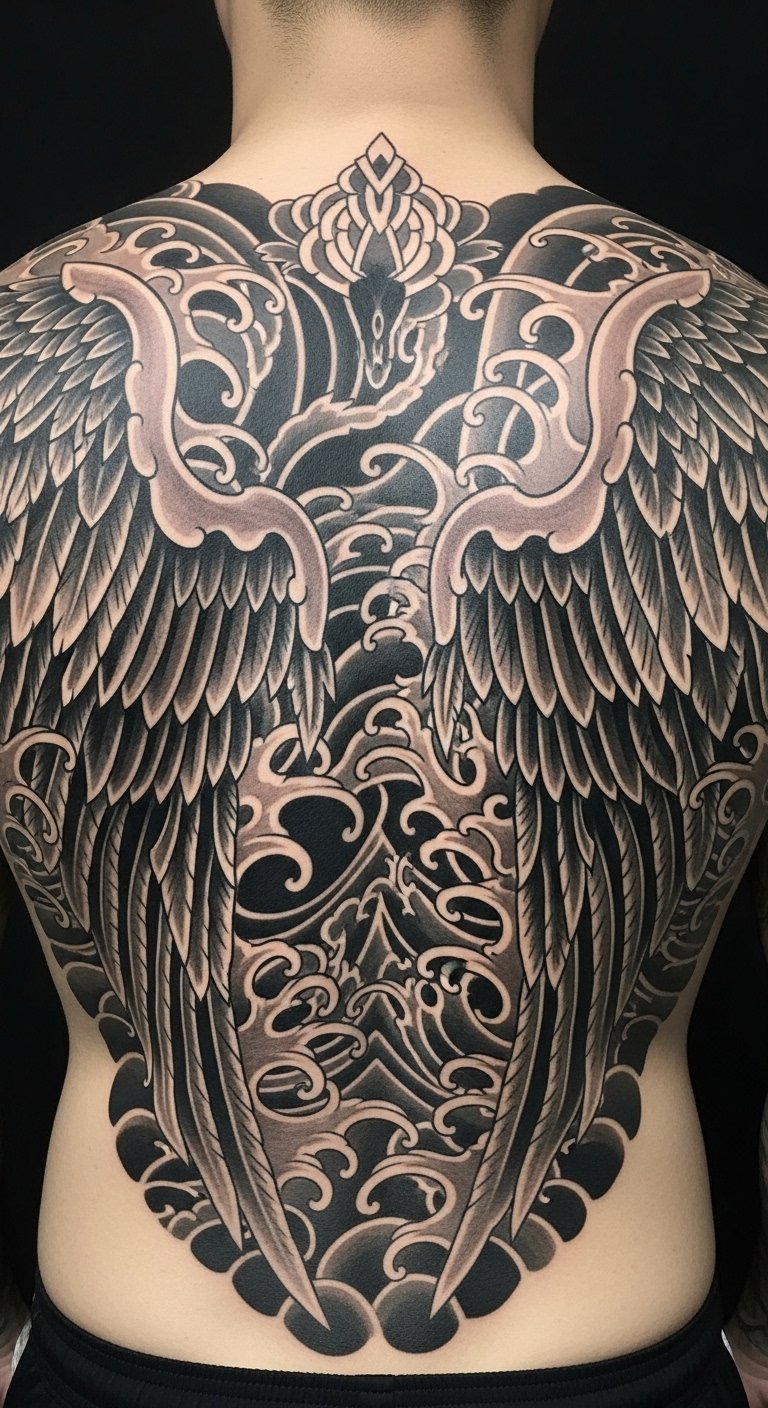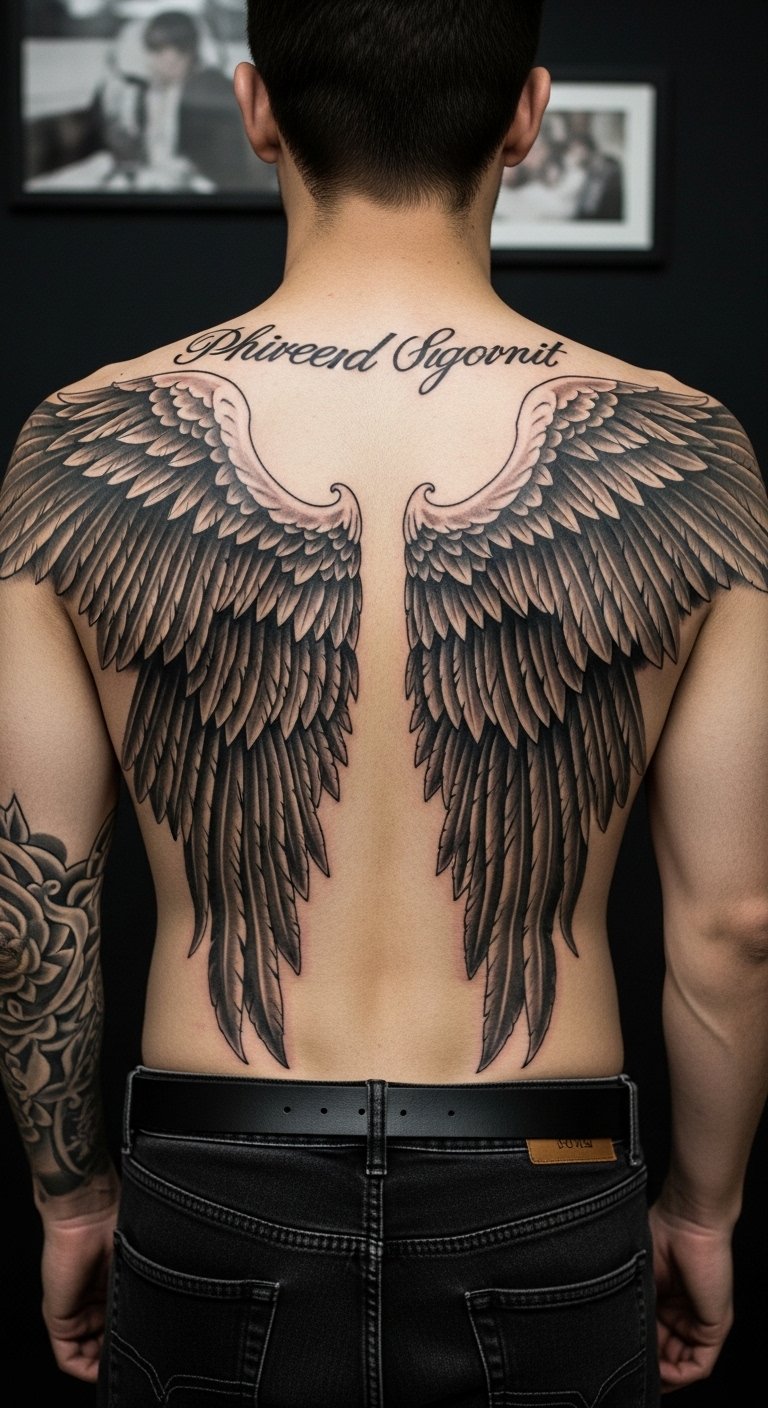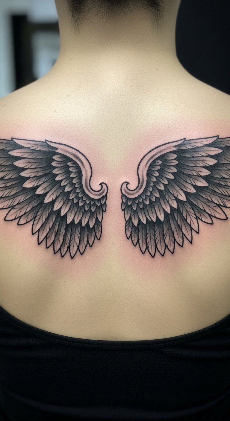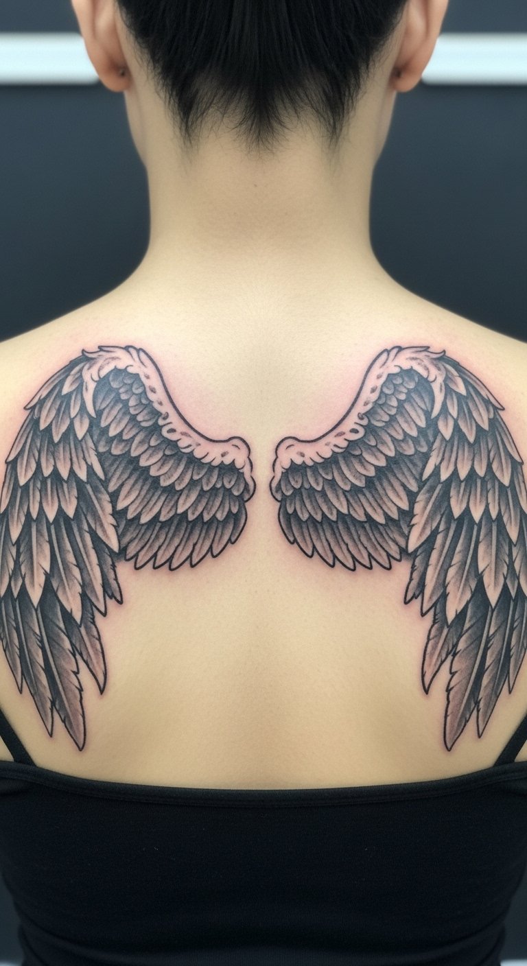Think about large, symmetrical feathers that spread across your back. This design works well for a first tattoo. Start with a sketch on paper to see how it fits. Use free online templates for ideas. Pick a local artist who does clean lines. For budget options, try temporary versions from drugstores first. They last a week and cost less than $10. Add personal touches like a small heart in the center. This makes it unique without extra cost. Keep the process fun and simple. Choose spots that heal easy, like your upper arm. You’ll enjoy the result every day.