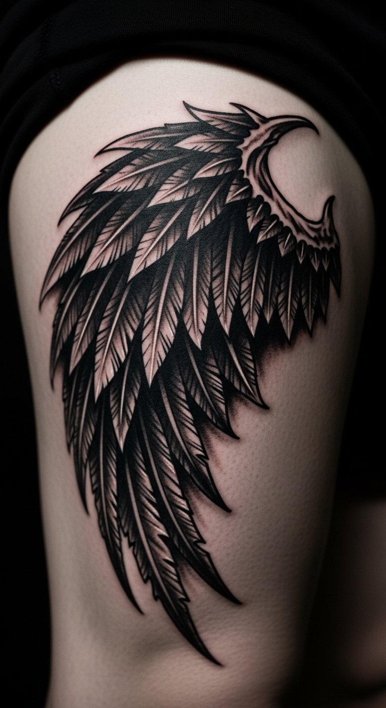 Go for pointed, dark feathers for an intense look. Put on your thigh. Search horror themes. Outline on skin with markers. Free tool. Find underground artists online. Rates are reasonable. Try airbrush stencils at home. They wash. Add horns for flair. Choose flexible spots. This idea stands out boldly.