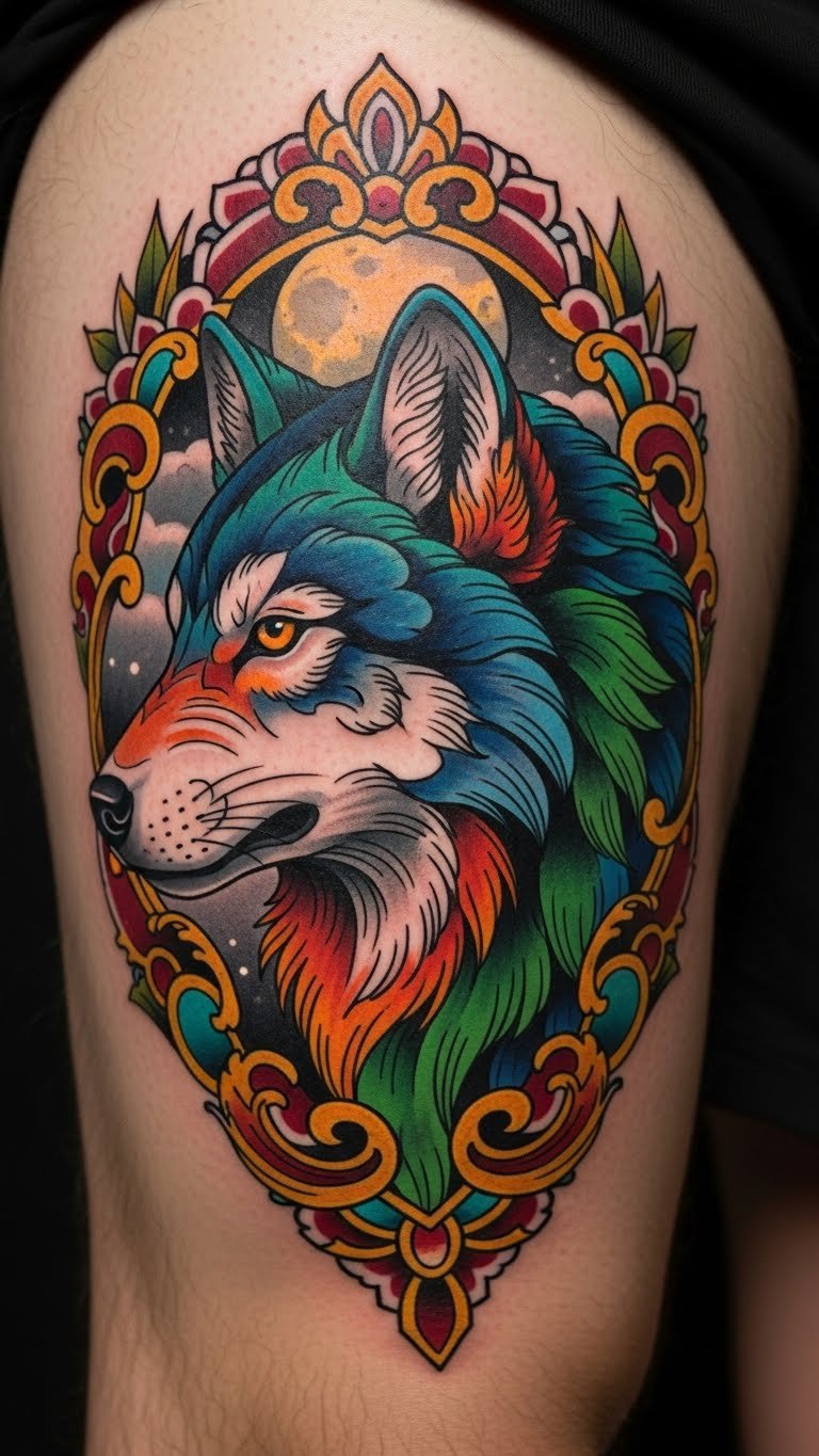 Update the classic with neo-traditional elements, adding colors and details to a fierce wolf design. It’s fresh yet rooted. Sketch updated versions on paper. Put it on your thigh for a personal spot. Look for options at $160. Use digital tools for free planning. The style mixes tradition with personal flair. Select key colors to stay affordable. Connect it to family stories. Find artists through friends. Basic routines keep it intact.