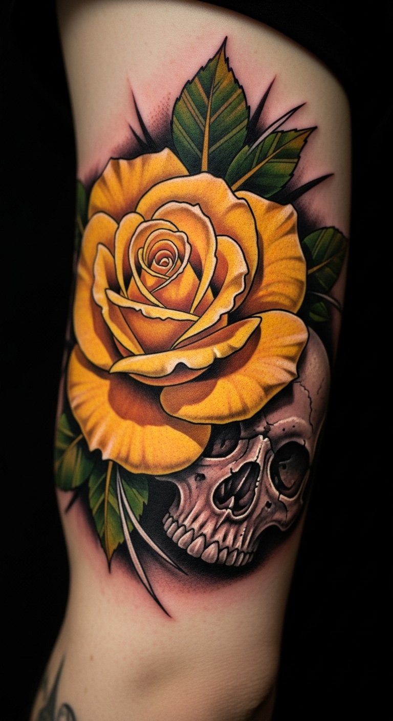Pair a yellow rose with a skull for life’s contrasts. Choose your bicep for easy viewing. Find artists online for under $90. Try drawing it on paper with markers as a home trial. Keep the rose bright to balance the dark. It’s a thoughtful way to remember. Use simple tools like a pen to plan. This design adds depth without complexity. Go for it if you want meaning.