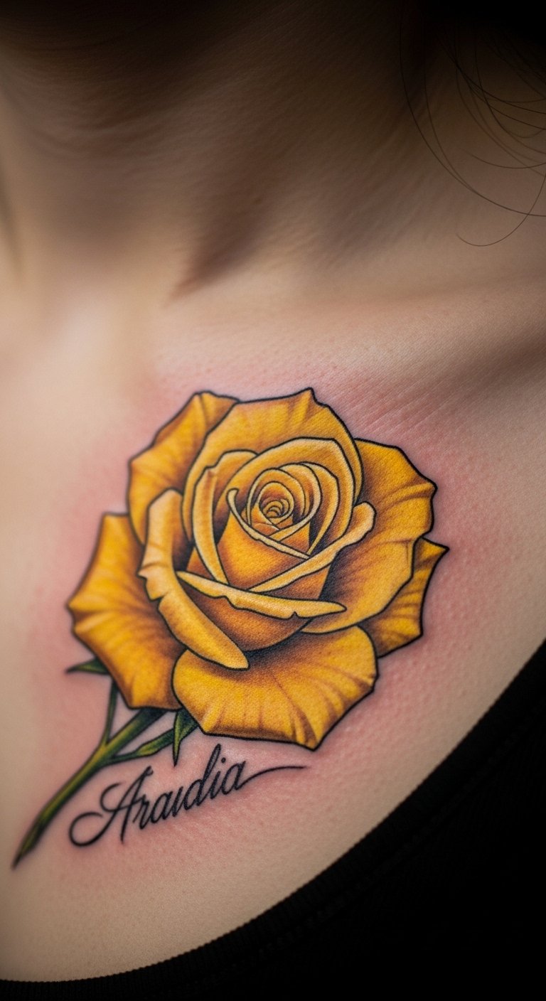 Mark fresh starts with a yellow rose and butterfly. Place it on your collarbone for subtlety. Look for deals around $75. Draw it with crayons at home first. The butterfly adds motion. It’s inspiring and light. Plan with free online tools. This design sparks change. Start here for new chapters.