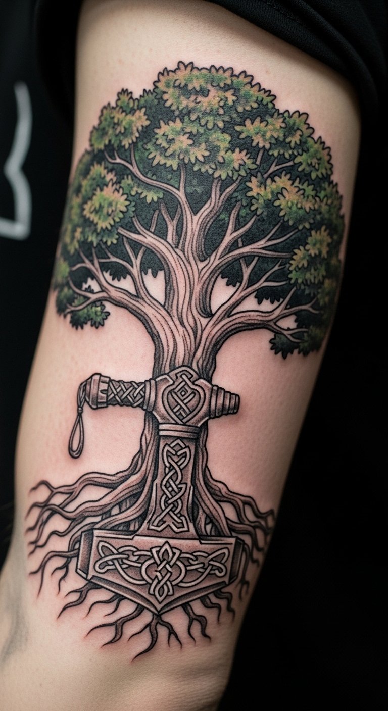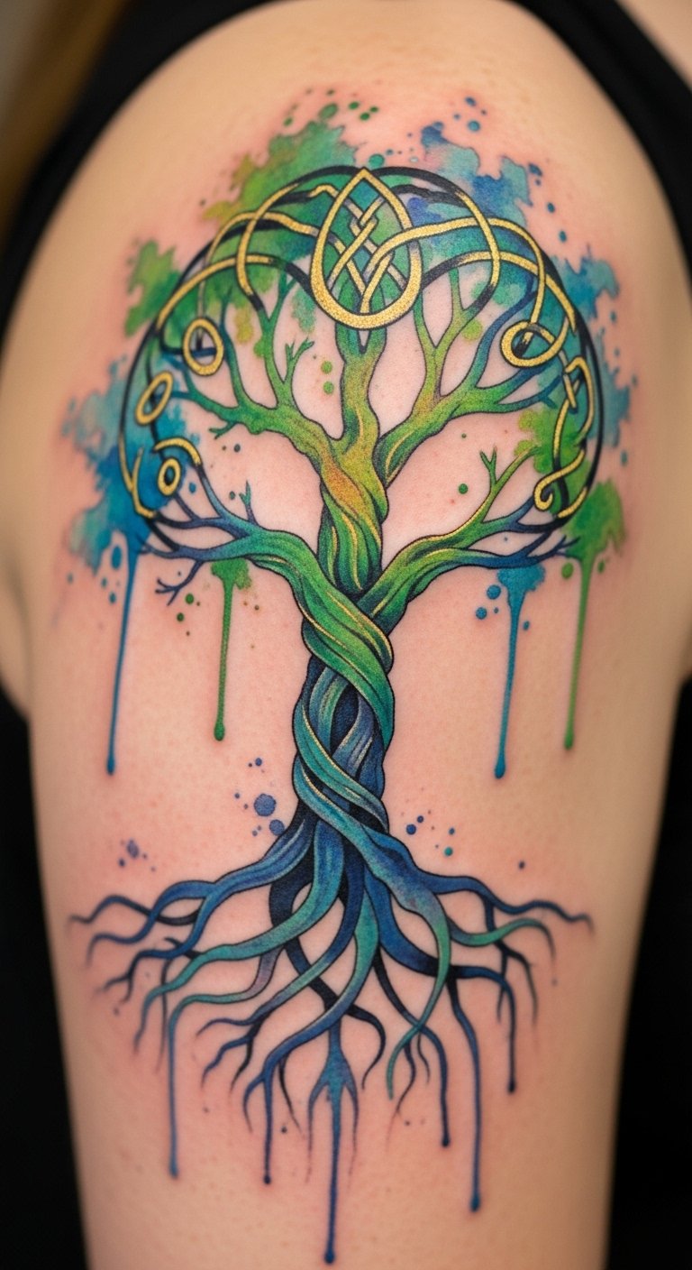 Watercolor Yggdrasil brings energy to your skin with bright hues. Picture greens for leaves and blues for roots, all blending softly. It captures the tree’s vitality in a fresh way.