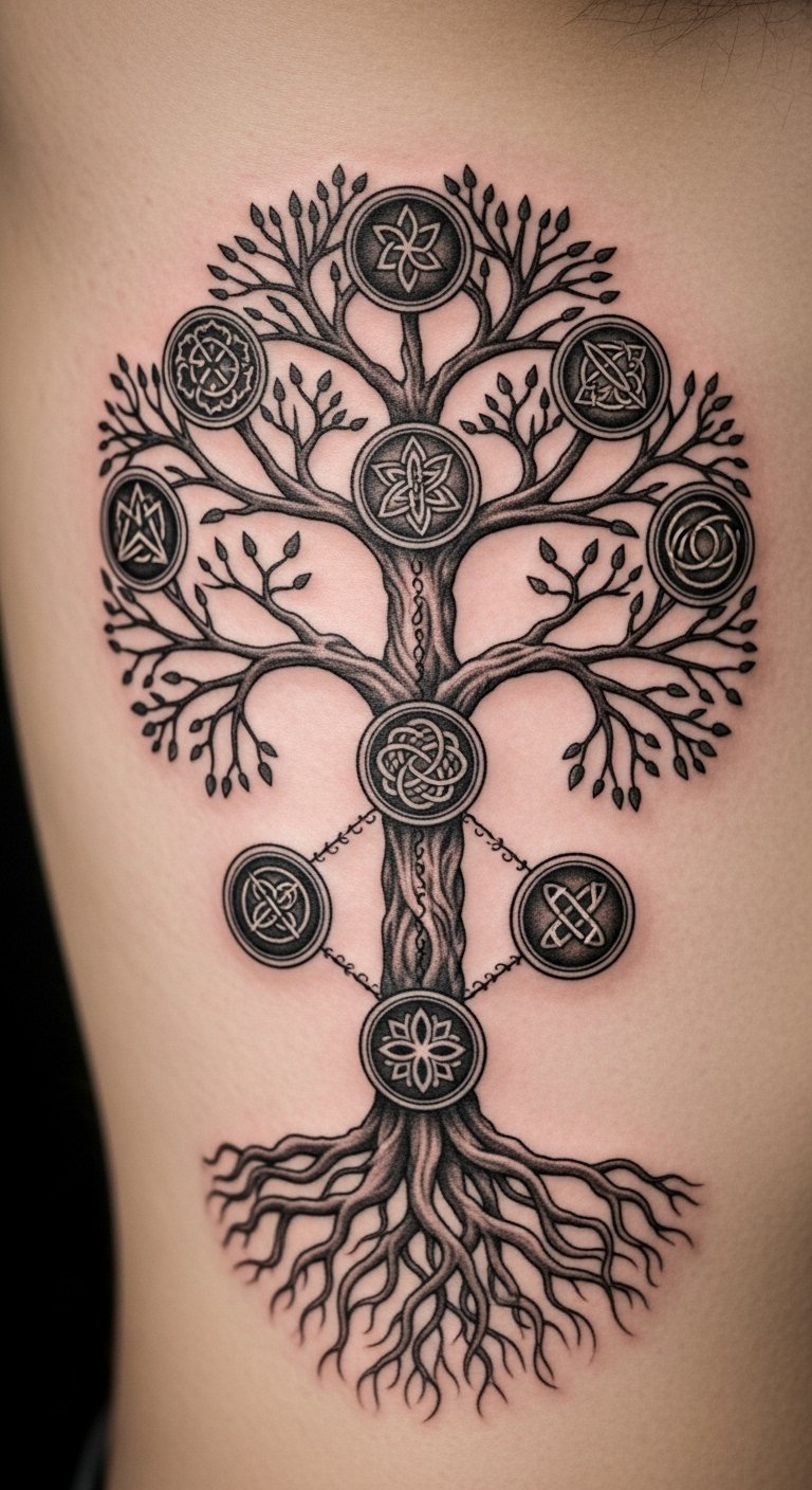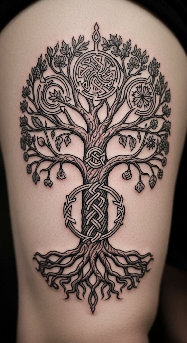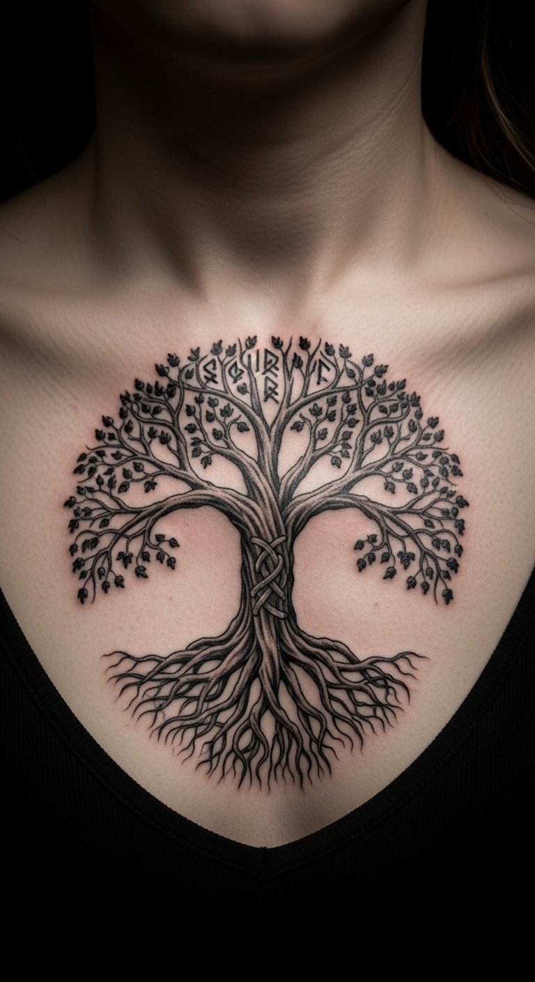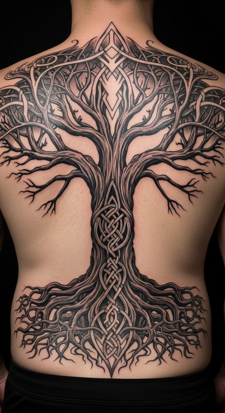 Go for realism with black and grey Yggdrasil. This style adds shadows and textures, making the tree look alive on your skin. It’s all about stability and strength.