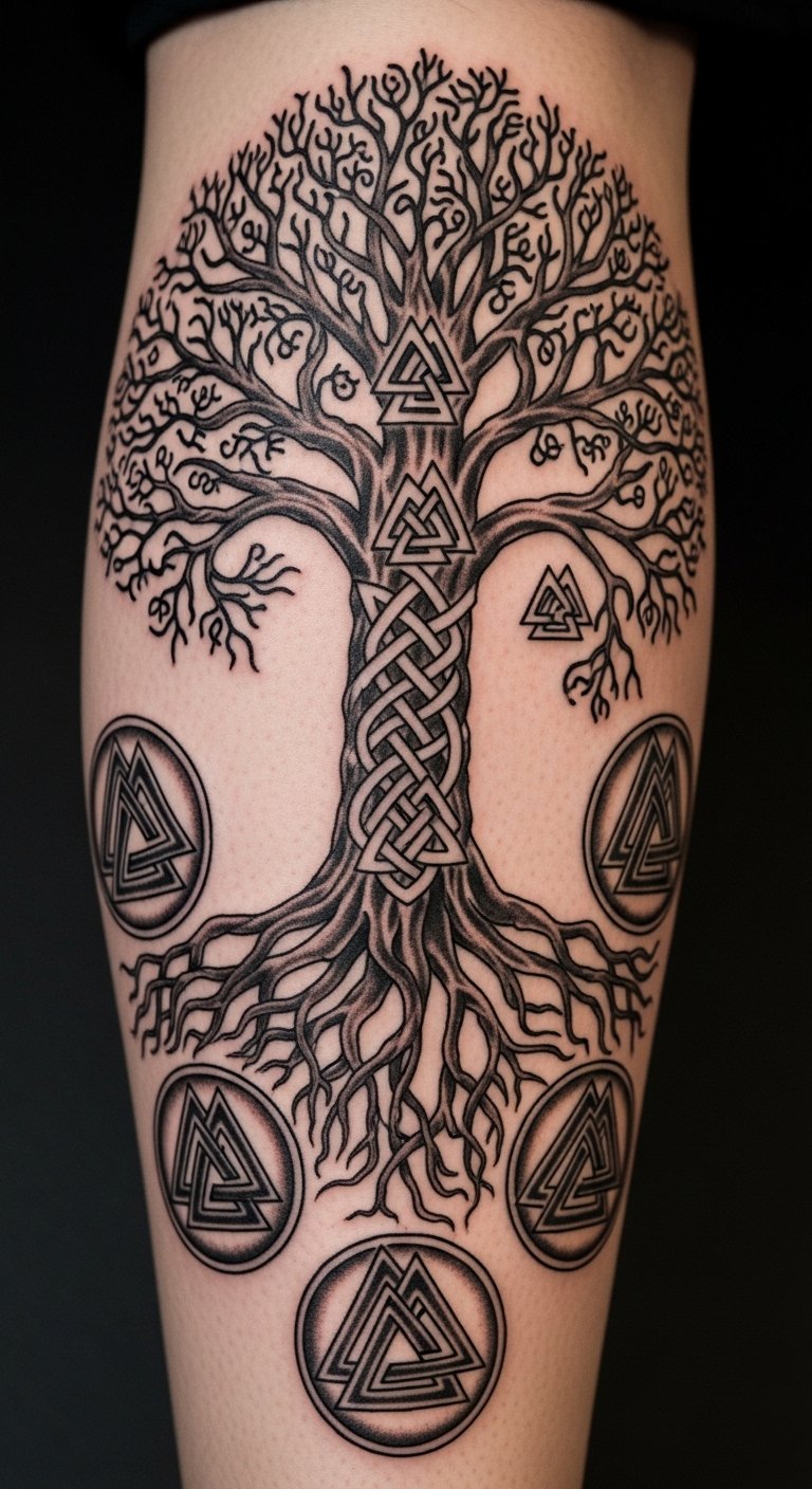 Weave Valknut knots into Yggdrasil for themes of fate and warriors. It creates a layered, meaningful design.