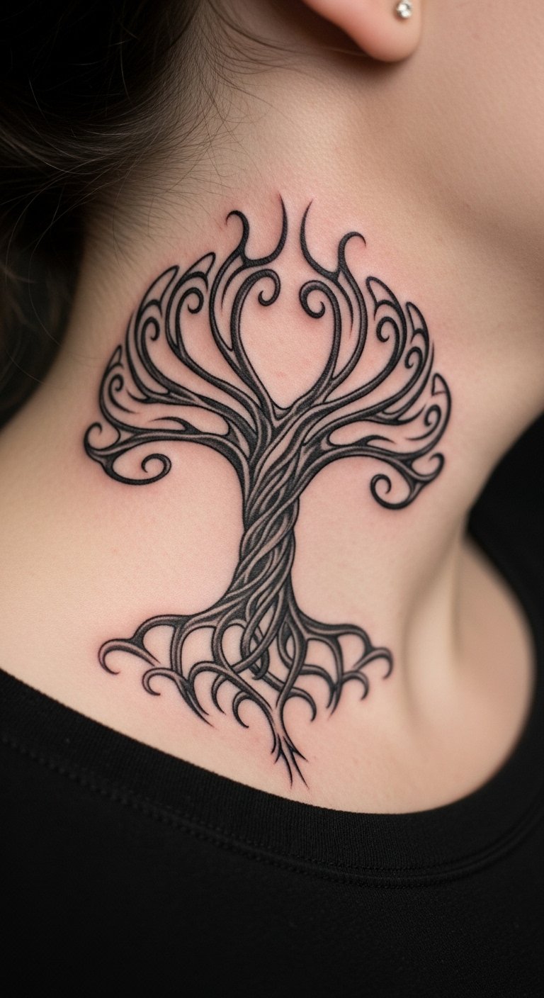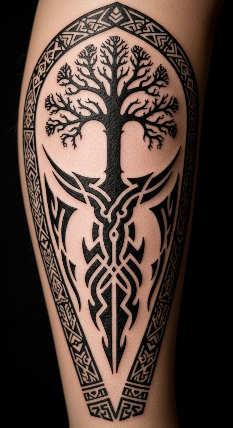 Incorporate tribal patterns around Yggdrasil for a cultural, edgy feel. It merges styles seamlessly.