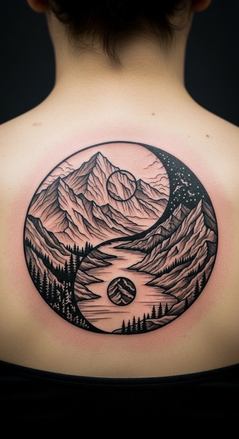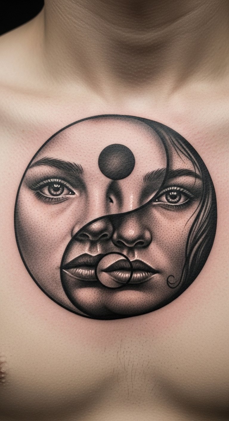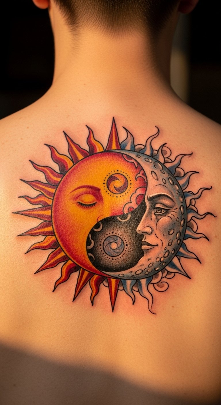 Blend day and night in one cool tattoo. A sun and moon fusion yin yang shows how opposites work together. Picture a sun half with rays and a moon half with stars, all in one circle.