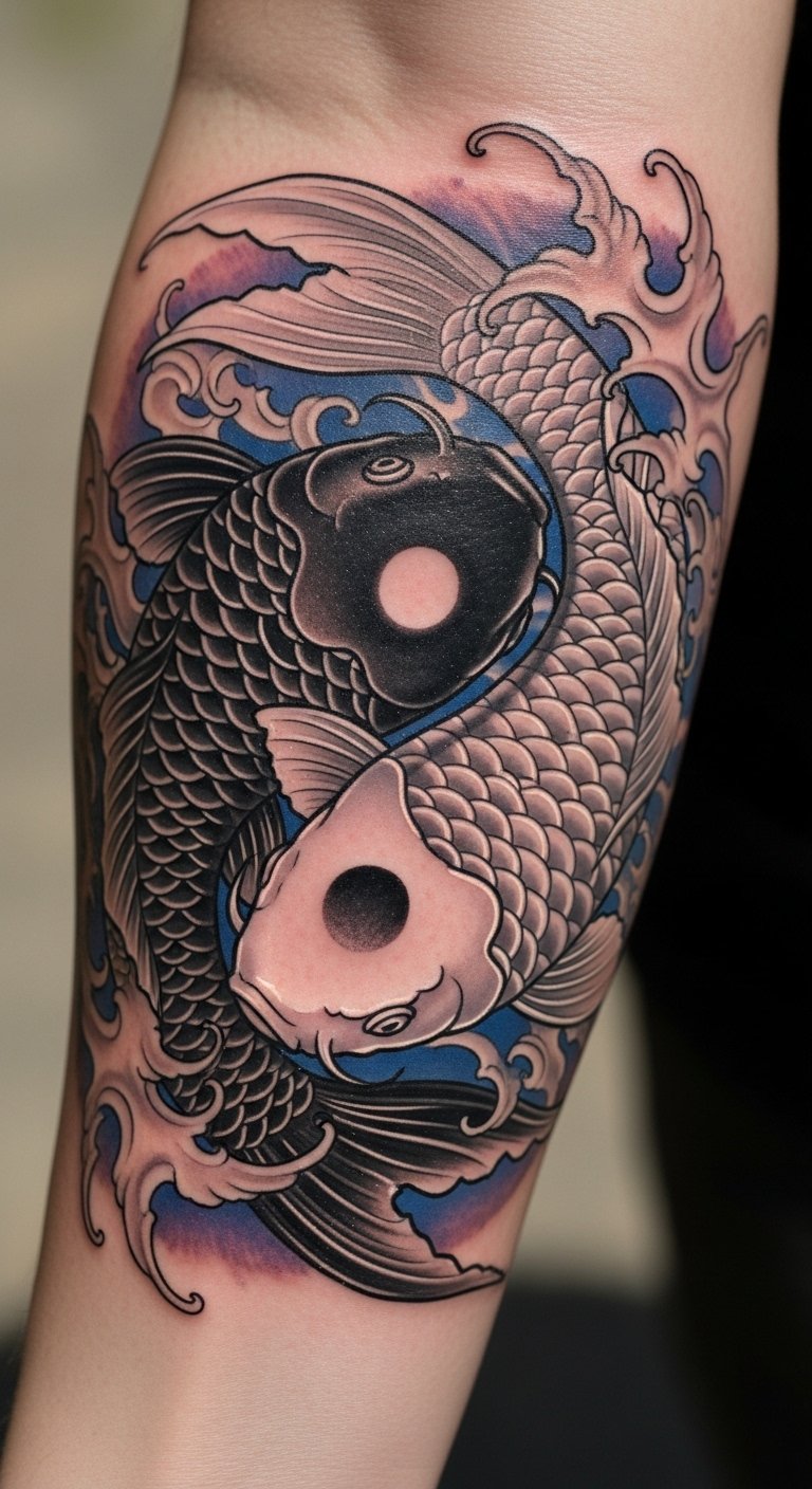 Koi fish bring movement to yin yang. Imagine fish swimming in the yin yang shape, symbolizing life’s flow.