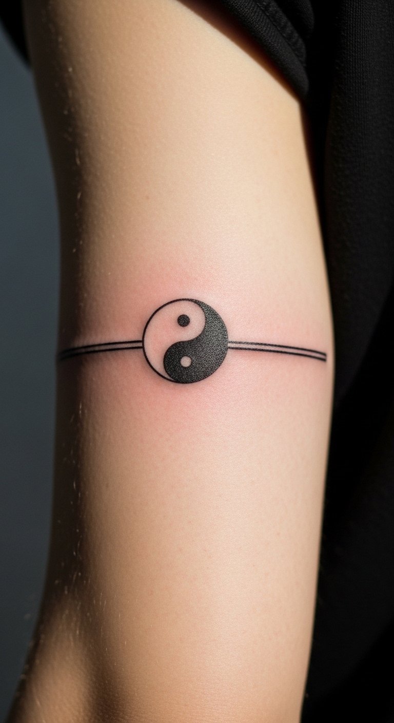 Go slim and sleek with an arm band yin yang. It’s a narrow strip with the symbol, perfect for subtle style.