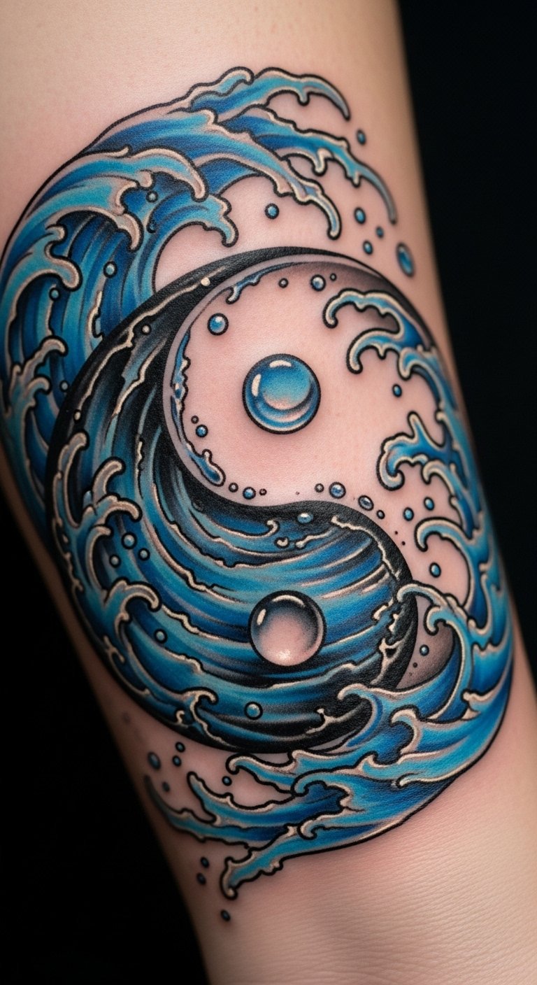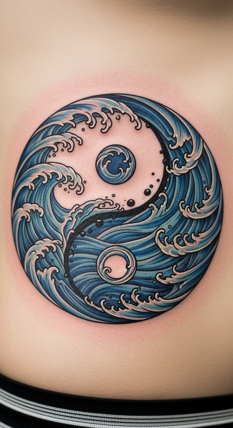 Add waves to yin yang for a watery vibe. Colors like blue make it pop, representing flow.