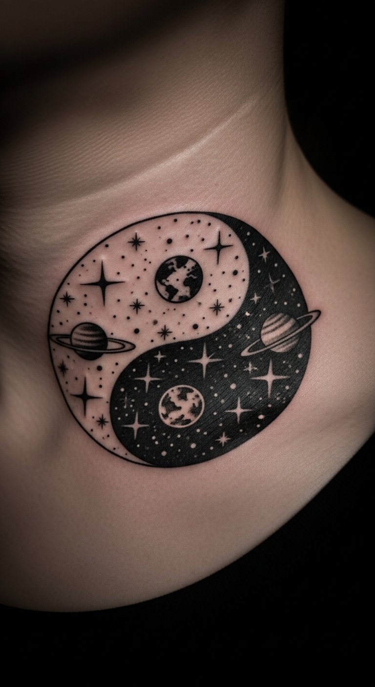 Stars in yin yang bring the cosmos close. Tiny dots form the symbol, linking to the universe.