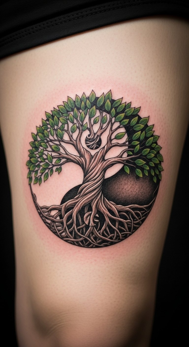 Trees merge with yin yang for growth vibes. Roots and leaves create the shape, symbolizing stability.