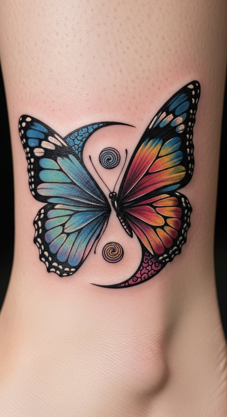 Butterflies add flight to yin yang. Wings form the halves, showing change and beauty.