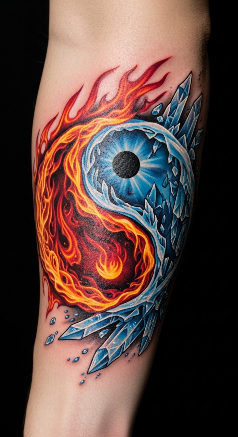 Fire meets ice in this yin yang design. One half burns, the other freezes, for extreme balance.