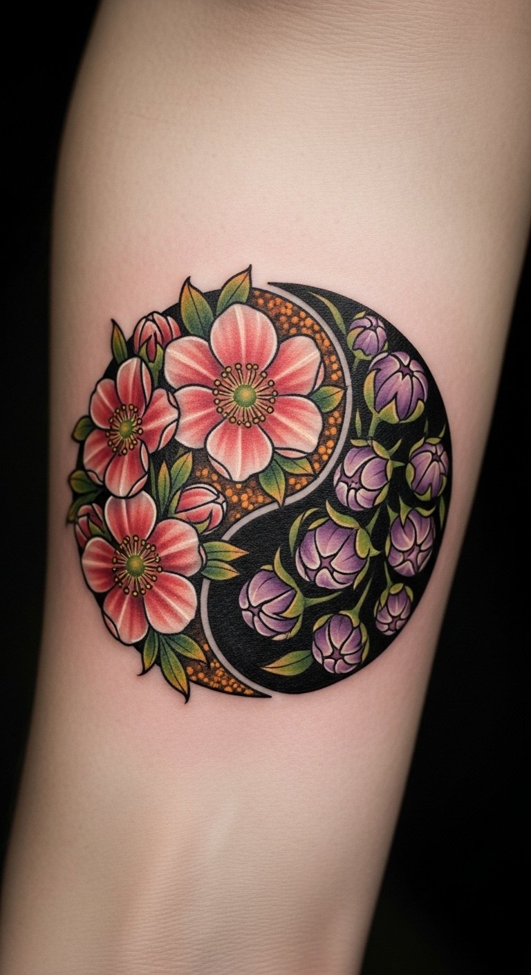 Flowers in yin yang show growth stages. Blossoms versus buds create the design, for new beginnings.