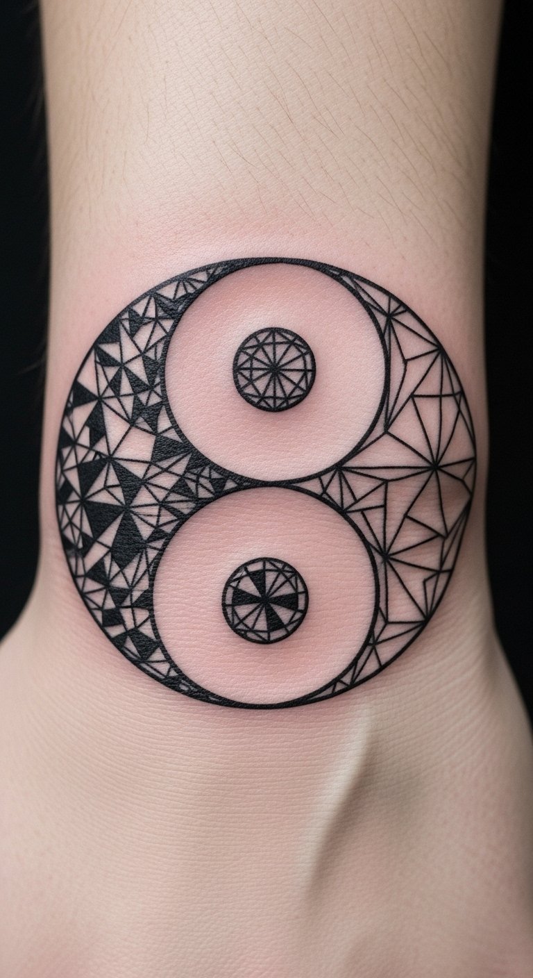 Shapes like triangles mix with yin yang. Geometric patterns add a modern edge to balance.