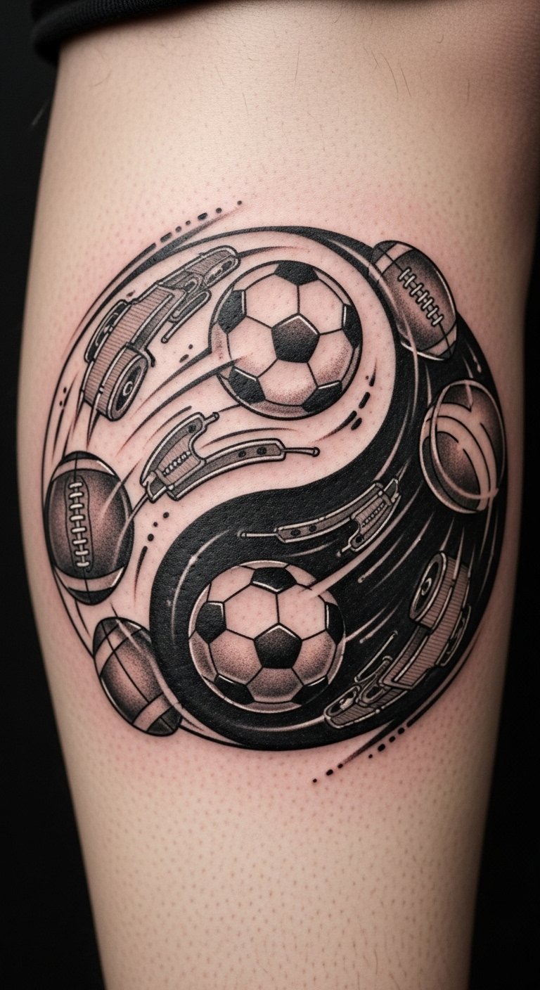 Sports gear fits yin yang for active types. Balls in the halves show play.