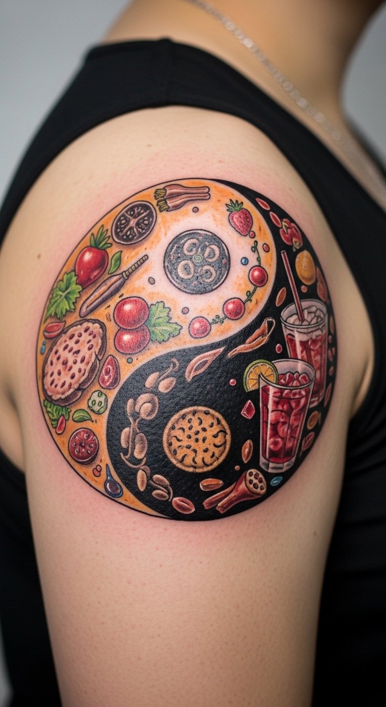 Food versus drink in yin yang for fun eaters. Items like fruit and cups form it.
