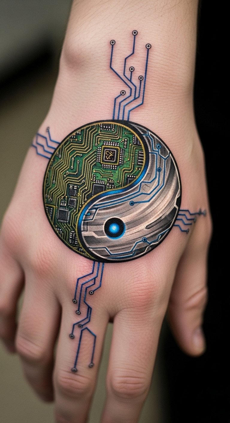 Gadgets mix with yin yang for techies. Circuits create the balance.