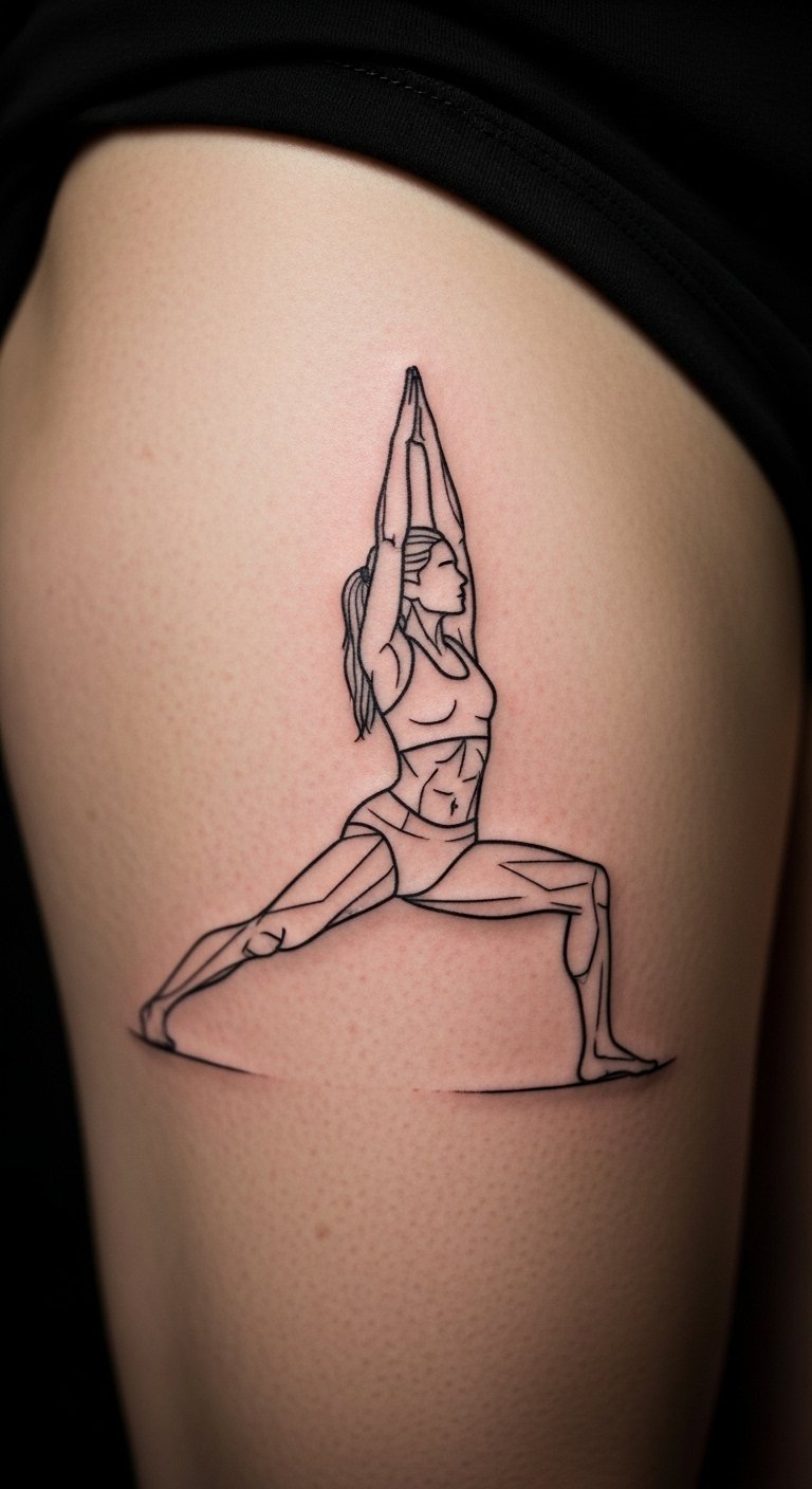 Warrior pose stands for inner power. This tattoo motivates your sessions. Ink it on your thigh for energy. Draw poses from yoga videos. Find deals at pop-up events. Pair it with a sun symbol. Sketch on paper with ease. This idea empowers your day. Choose outlines to save money. It’s a direct boost to confidence.