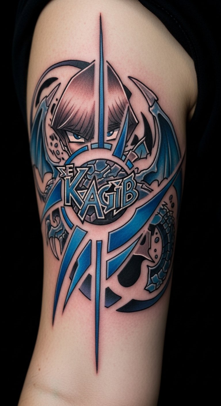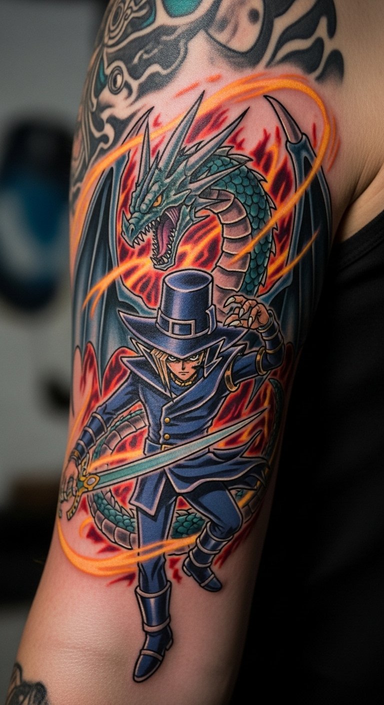 Think of Kaiba’s dragon as your bold statement. Grab a basic drawing tool to copy the shape. Place it on your chest for impact. Opt for grayscale to save on ink fees, maybe $60 total. Mix in small flames for your twist, using household markers for practice. This idea works for sleeves. Start with outlines on skin-safe paper. A DIY stencil from online prints costs pennies. Make it pop with simple shading. You’ll enjoy showing it off at events. Keep the design flow easy. Add it step by step for a pro feel.