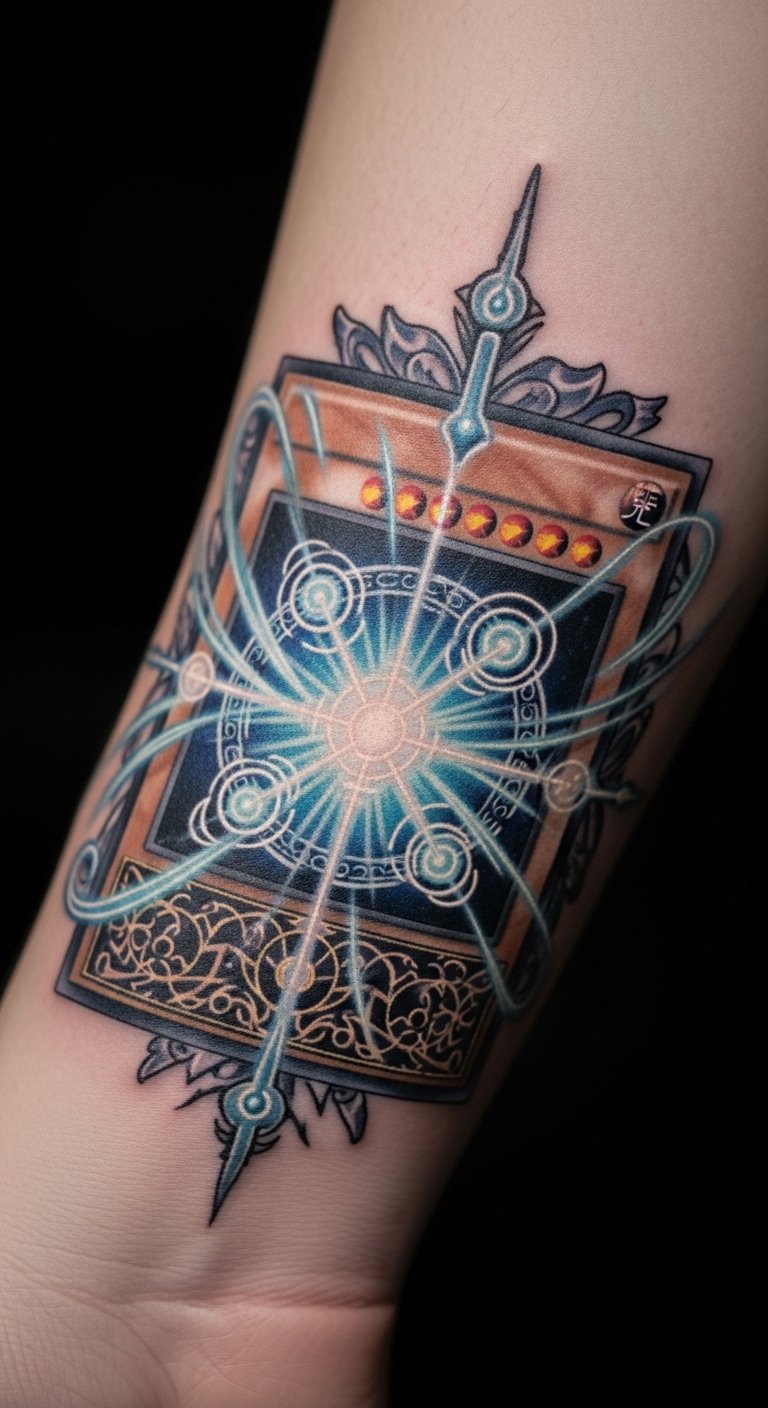A spell card tattoo adds magic to your arm. Jot down the card layout on paper. Place it on your wrist for quick glances. Use simple lines for a $30 price. Include light bursts with basic pencils. This fits daily life. Make a DIY version with stickers. Practice on paper first. Add spark effects easily. It’s fun for fans. Build it piece by piece.