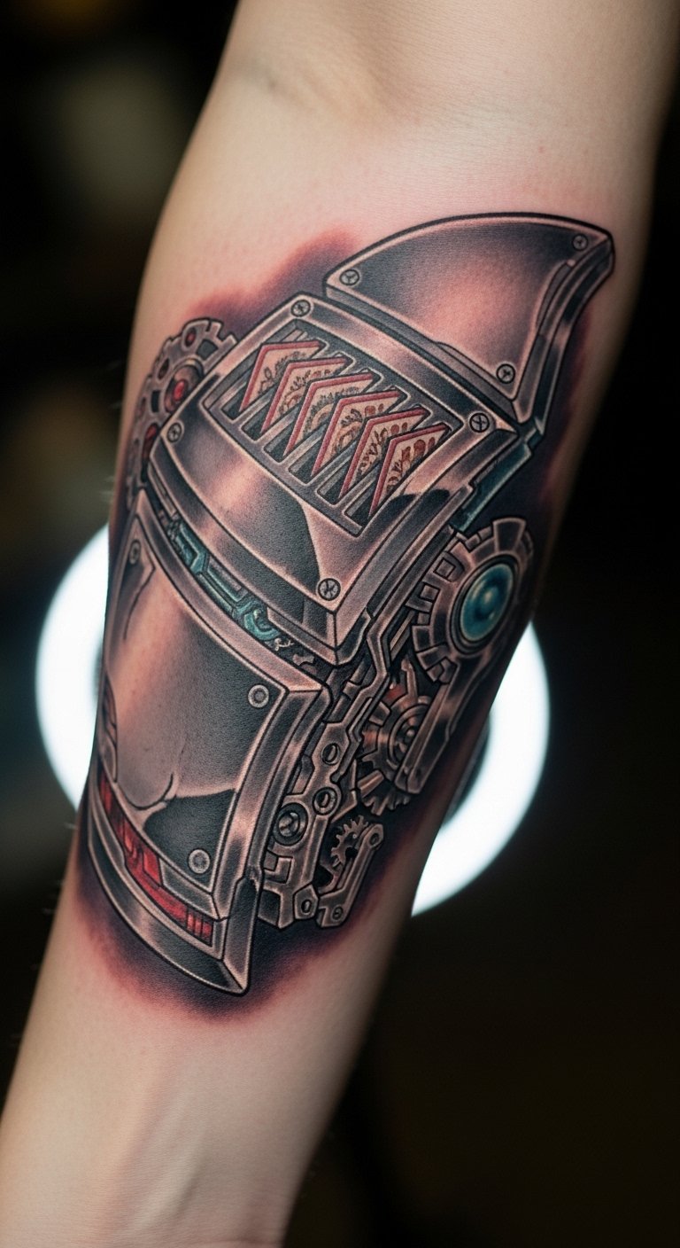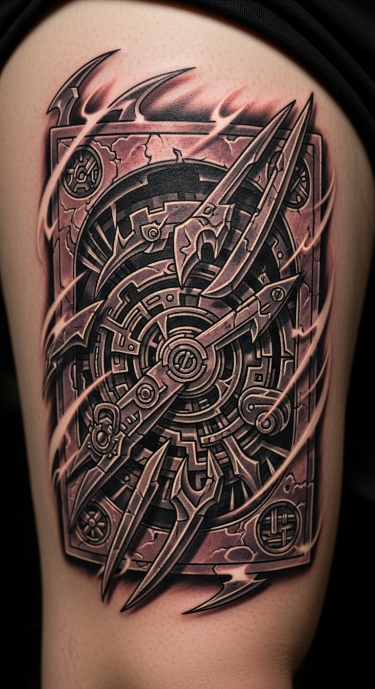 A duel disk tattoo puts you in the game. Draw the disk on paper. Wear it on your arm for play. Keep it basic for $60. Add cards with household items. This brings action alive. Make a mock-up with prints. Practice drawing gears. Make it interactive. Friends will notice. Build details one at a time.